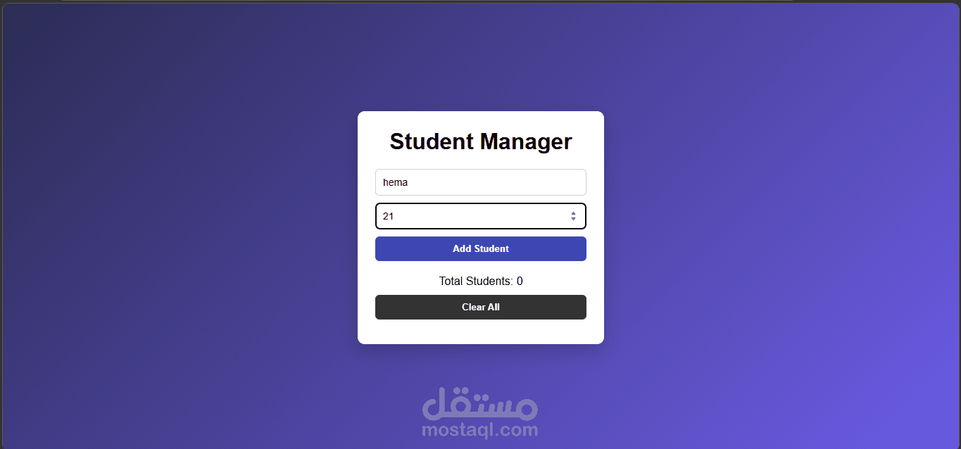 هو مشروع بسيط تم تطويره باستخدام React يهدف إلى تطبيق أساسيات إنشاء واجهات تفاعلية وإدارة البيانات داخل التطبيق. يسمح هذا التطبيق للمستخدم بإضافة طلاب جدد مع إدخال الاسم والعمر، ثم عرض قائمة بالطلاب المضافين داخل الصفحة.