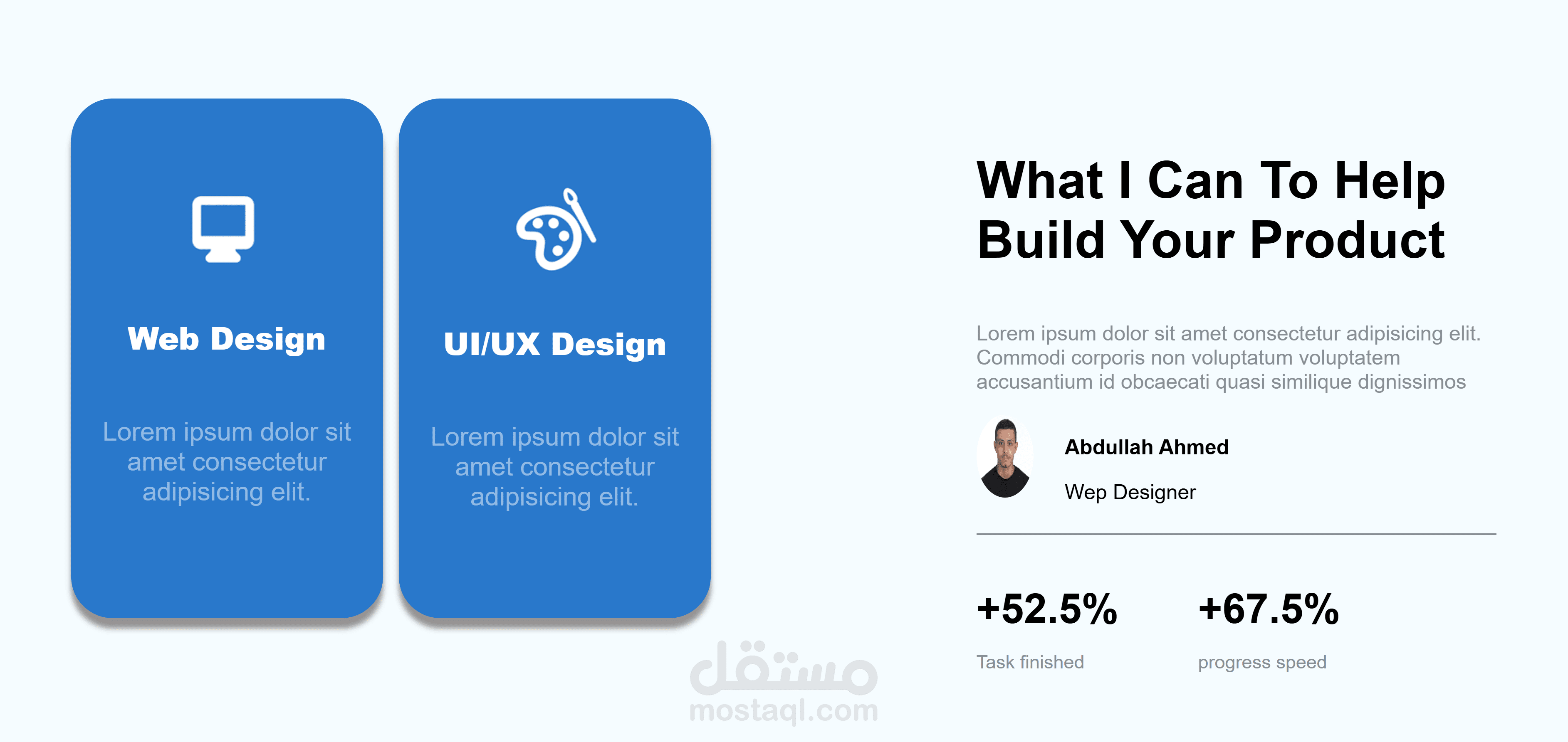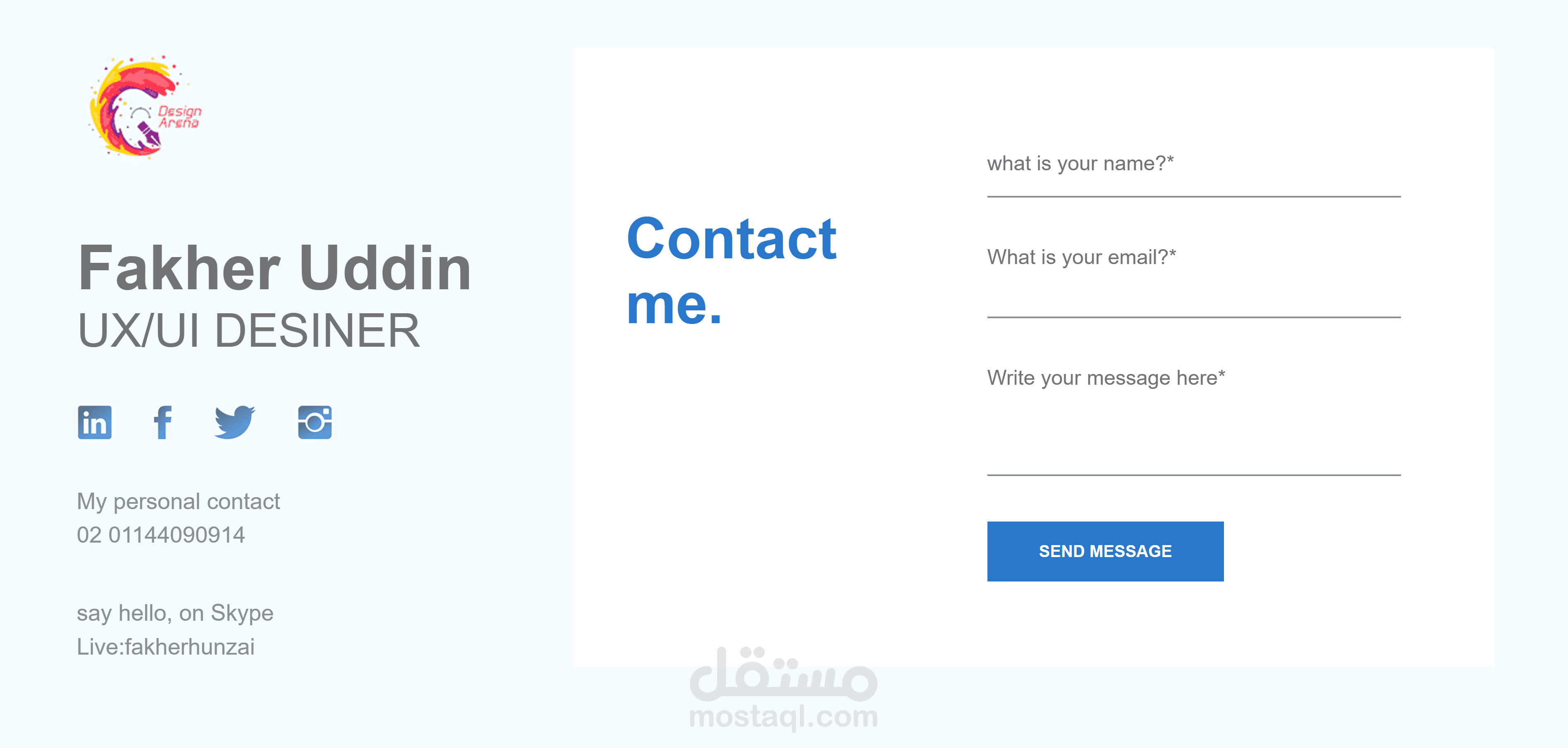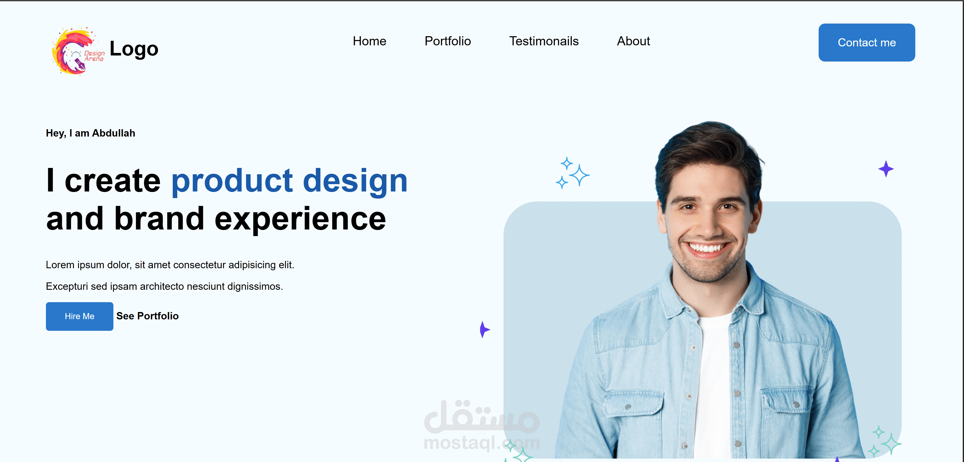 ده موقع بورتفوليو شخصي لمصمم UX/UI معمول كله بـ HTML وCSS من غير أي تعقيد. أول ما تدخل هتلاقي صفحة الترحيب فيها اسم المصمم وصورته وكلمات بسيطة عن اللي بيقدمه، مع أزرار واضحة تخليك تروح على البورتفوليو أو تتواصل معاه.