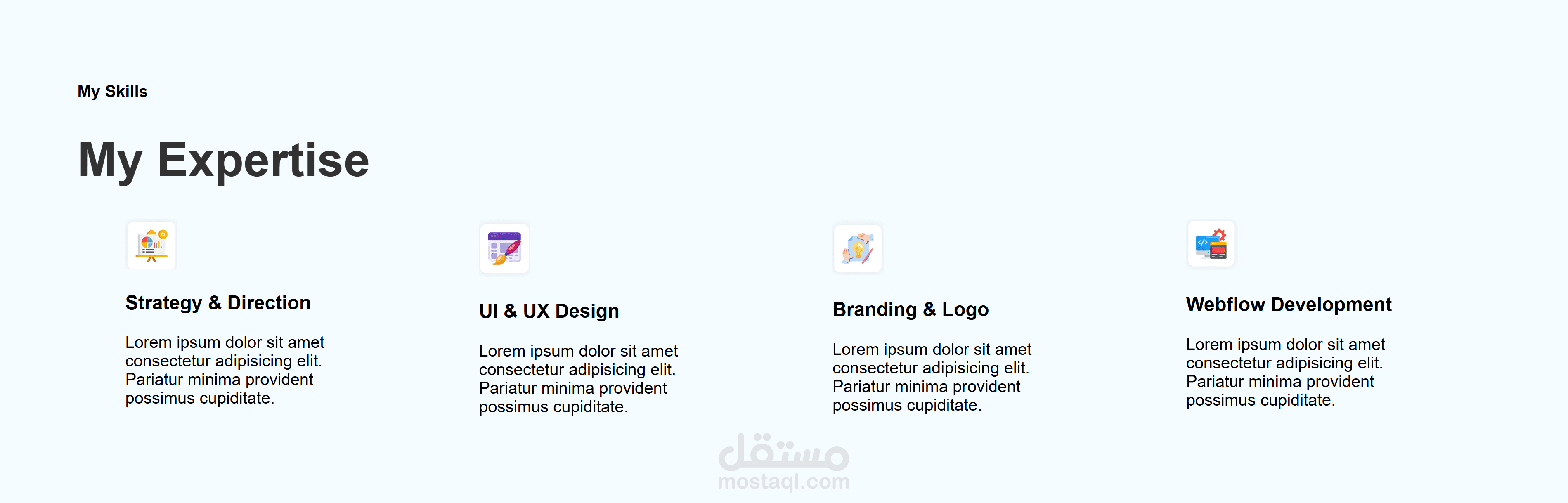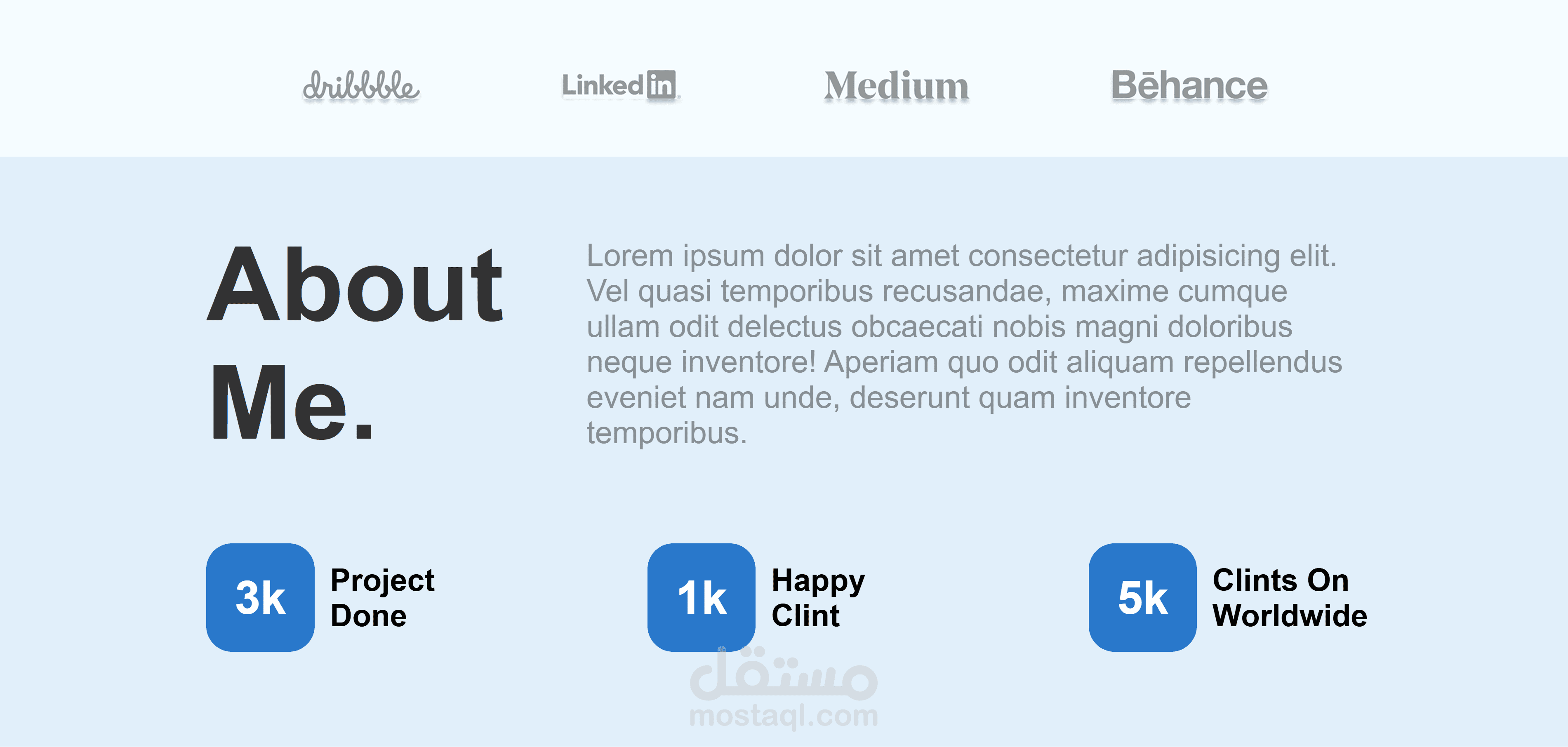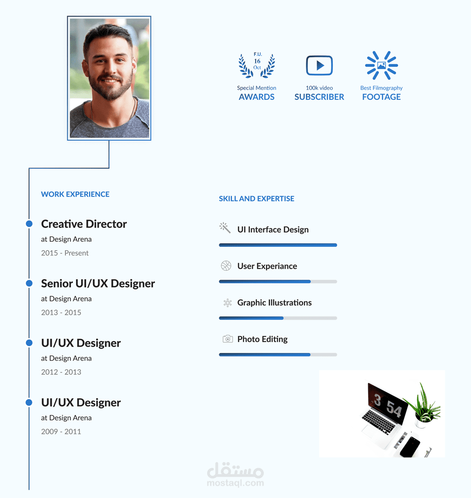 بعد كده فيه جزء صغير عن المصمم، بيحكي عن خبراته وعدد المشاريع والعملاء اللي اشتغل معاهم. كمان فيه جزء للمهارات والخبرة، كل حاجة مرسومة بأيقونات، زي تصميم واجهات المستخدم، تجربة المستخدم، البراندينج، وتطوير الواجهات، وكمان فيه خبرة الوظايف السابقة ونسب مهاراته في المجالات المختلفة.