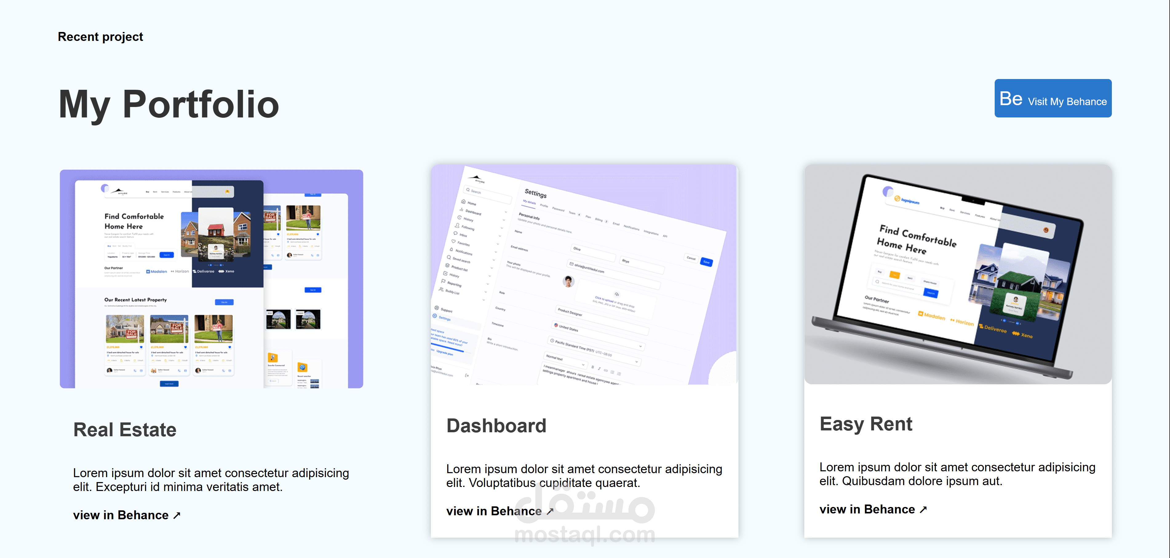 فيه بعد كده قسم الخدمات اللي بيقدمها، كل خدمة مع أيقونة ونص قصير يوضح قيمتها. بعده هتلاقي البورتفوليو نفسه، أمثلة حقيقية على المشاريع اللي عملها مع صور صغيرة ووصف وزر تشوف المشروع كامل.