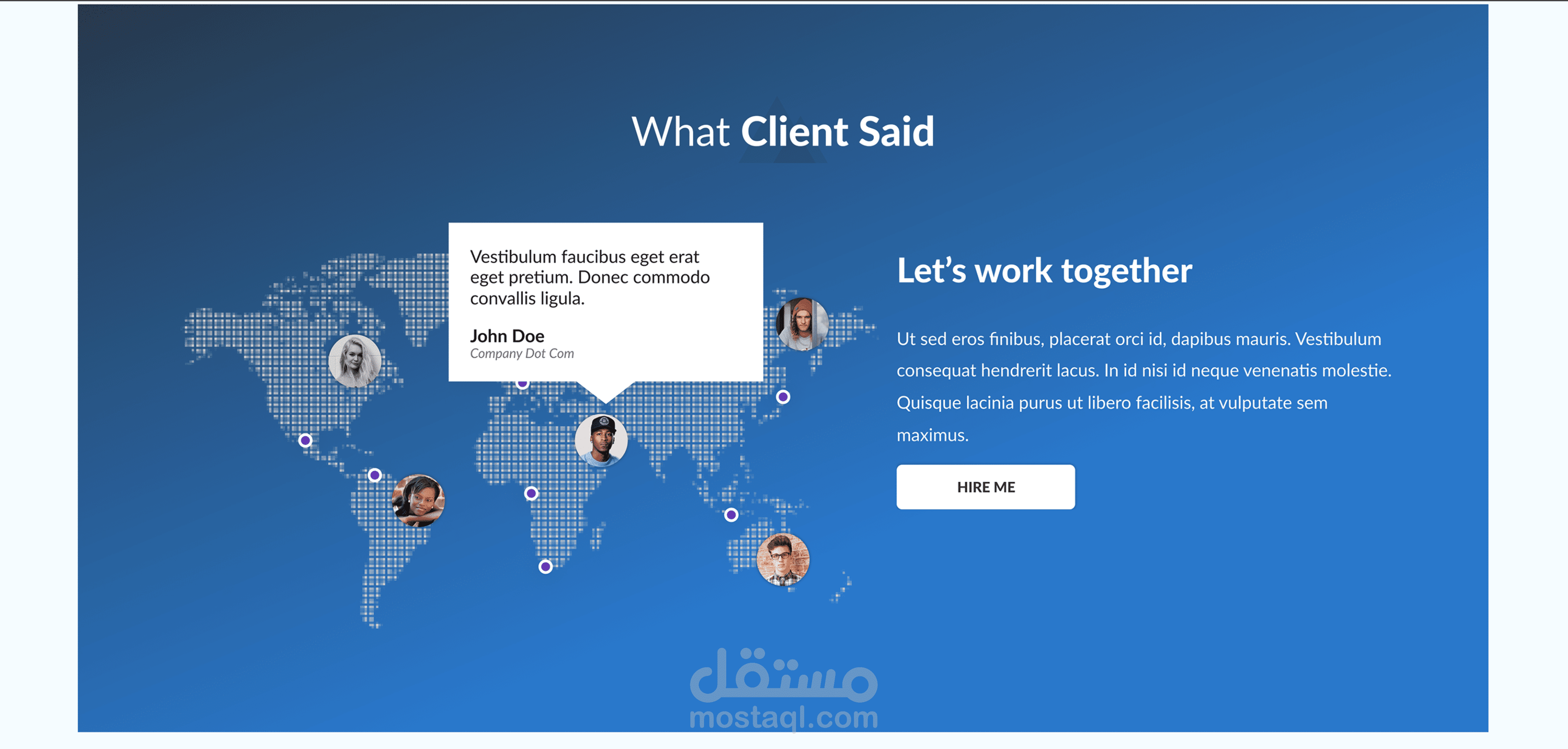 الصفحة كمان فيها آراء العملاء بشكل تفاعلي، مع خريطة تبين مكان العملاء وتعليقاتهم. وفي الآخر، فيه قسم الاتصال، معلومات التواصل، حساباته على السوشيال، ونموذج إرسال رسالة مباشرة.