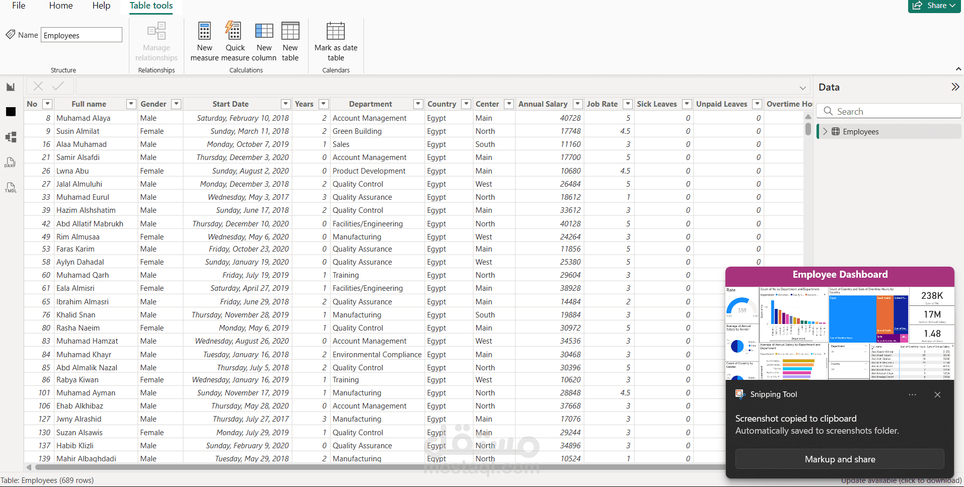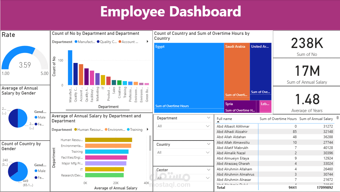 لوحة معلومات تفاعلية لتحليل بيانات الموظفين داخل المؤسسة وعرض أهم المؤشرات المتعلقة بالأداء والرواتب وساعات العمل الإضافية.