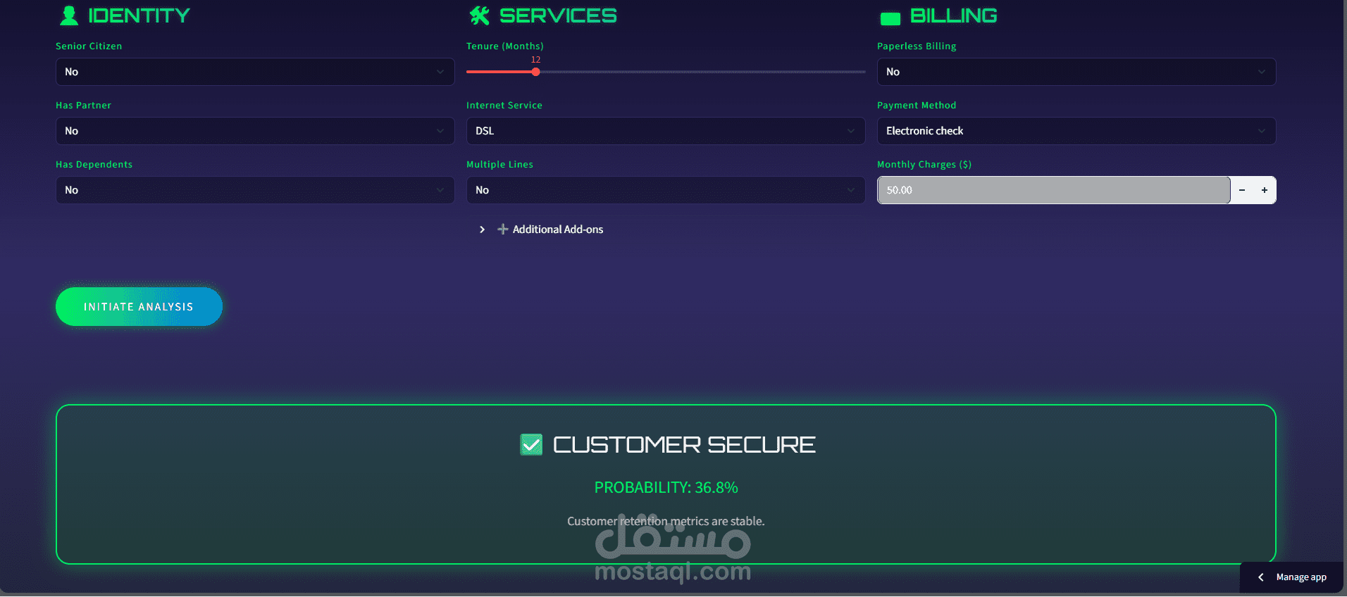 دعم اتخاذ القرار (Business Intelligence): النظام لا يعطيك أرقاماً صماء، بل يقدم تصنيفات ذكية لحالة العميل (مثل Customer Secure أو At Risk) مع رسائل توجيهية تساعدك في صياغة استراتيجيات الاحتفاظ بالعملاء.