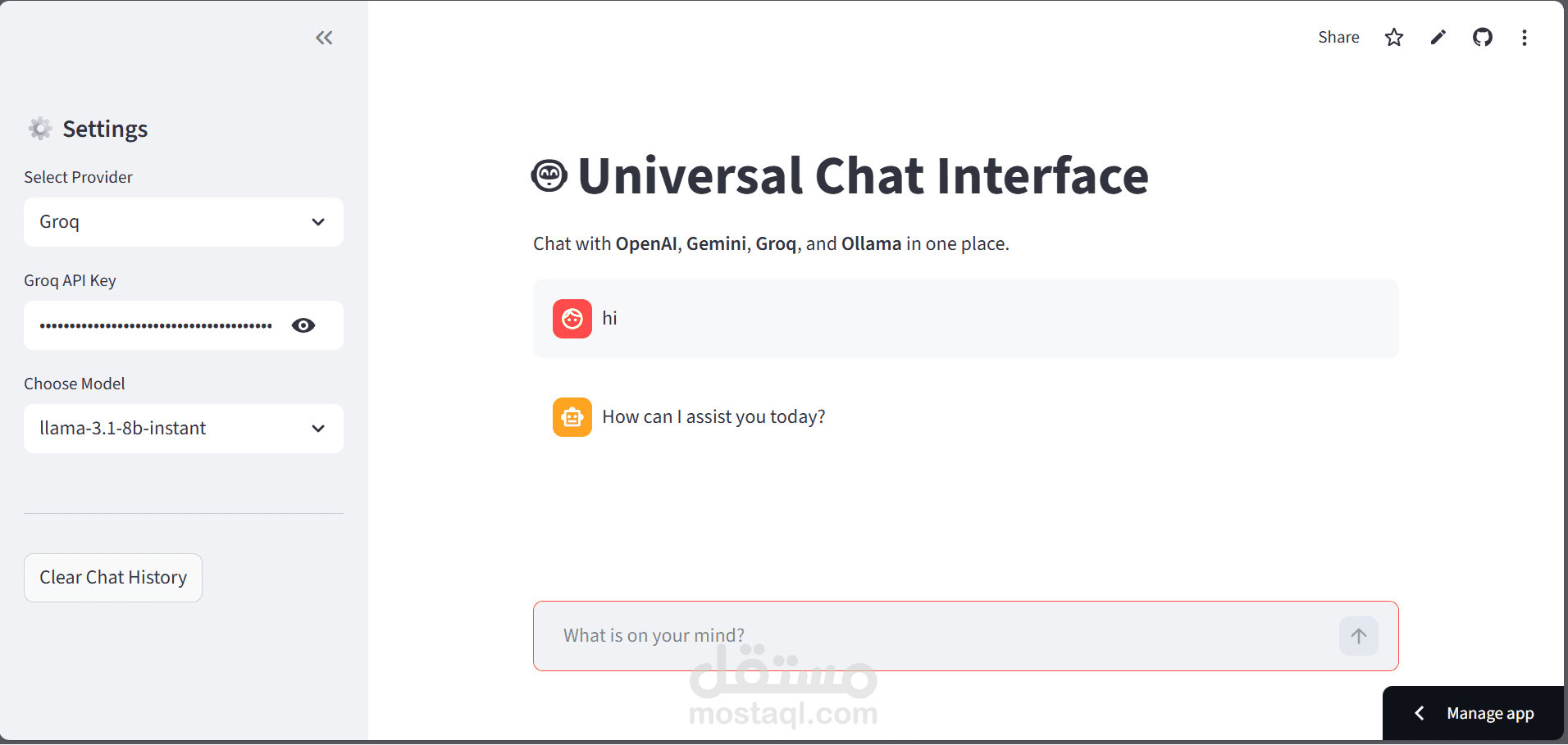بدل ما تشتت نفسك بين كذا موقع، المشروع ده عبارة عن منصة واحدة بتجمع لك وحوش الذكاء الاصطناعي في مكان واحد. تقدر تتكلم مع OpenAI, Gemini, Groq, و Ollama من واجهة مستخدم (UI) سهلة وبسيطة.