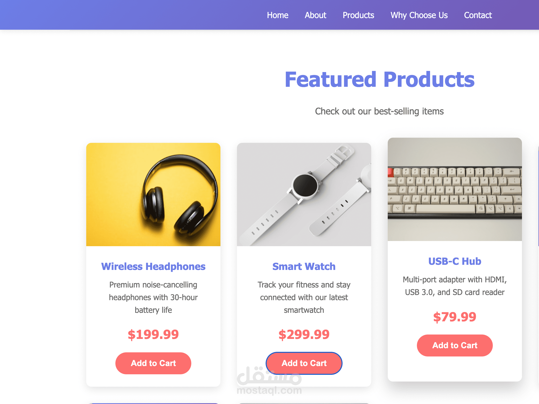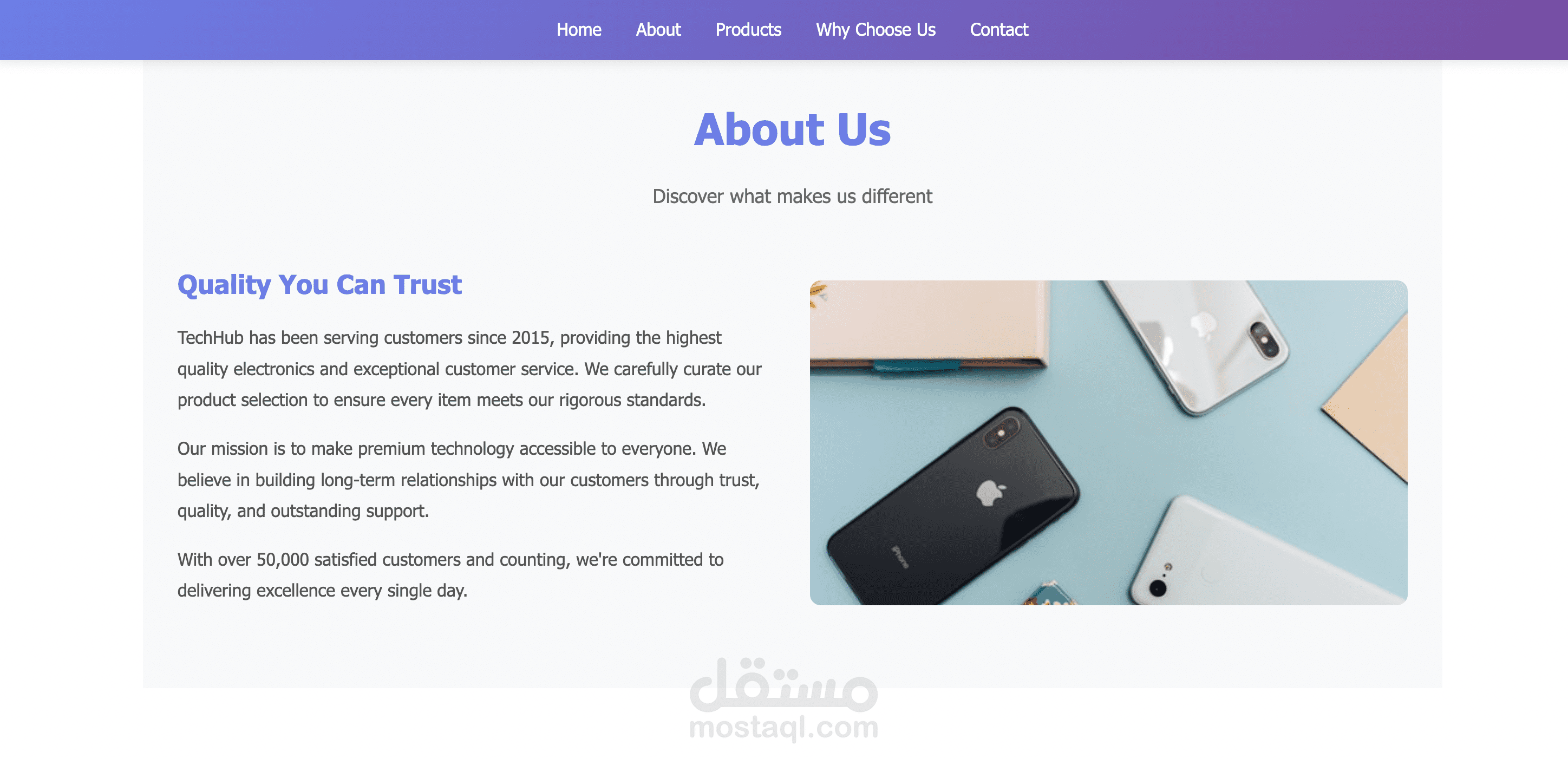 تطوير صفحة هبوط (Landing Page) لمتجر إلكترونيات باسم تك هب (TechHub) لعرض المنتجات بطريقة عصرية وجذابة. تحتوي الصفحة على شريط تنقل رئيسي يضم أقسام مثل: الرئيسية، من نحن، والمنتجات، مما يسهل على المستخدم التنقل والوصول إلى المحتوى بسرعة.