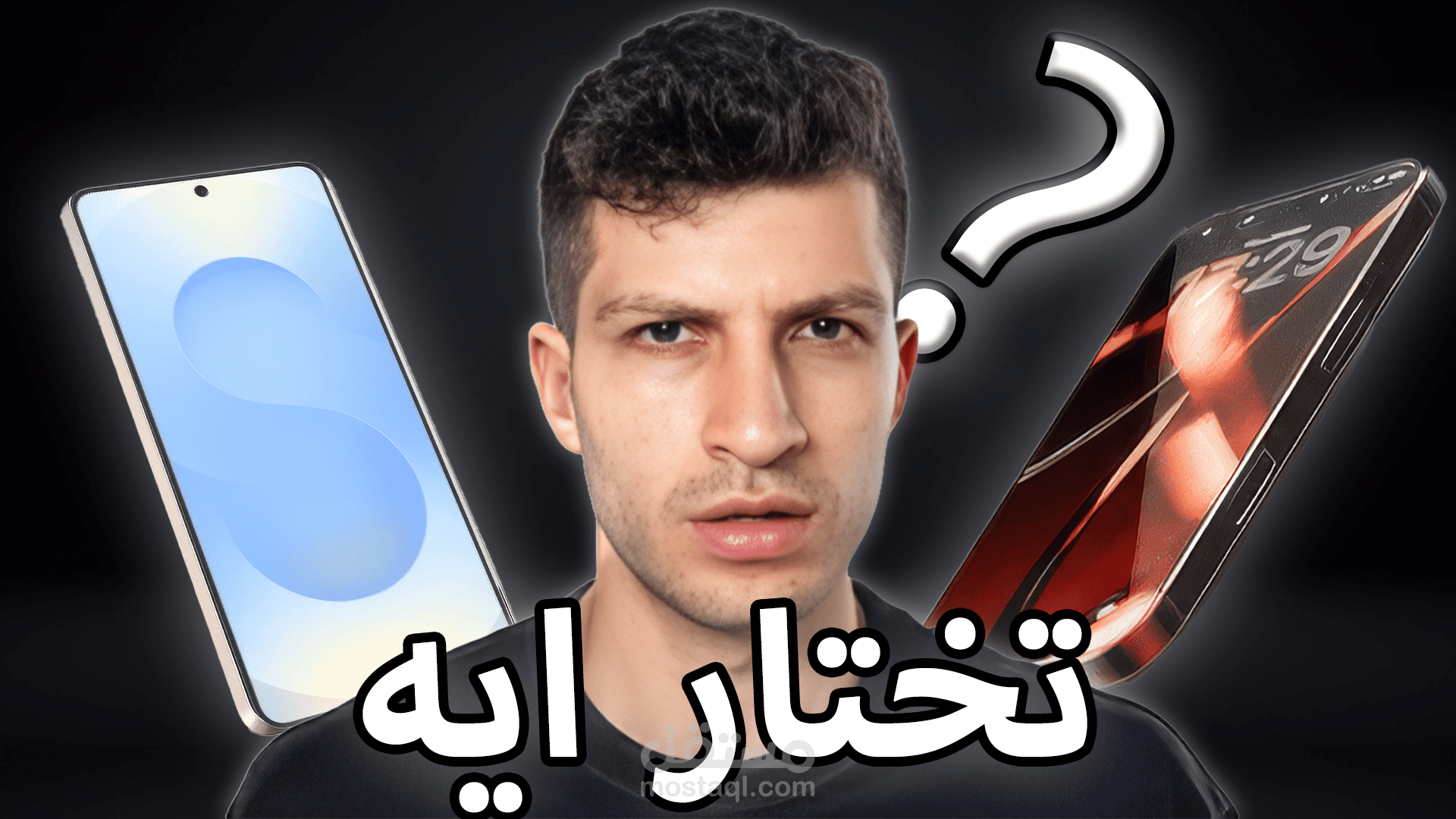 كان الهدف الأساسي هو تصميم صورة تخطف عين المشاهد وتعبر فوراً عن حالة "المقارنة والحيرة". تم تخطيط التكوين البصري ليضع المراجع في المنتصف بنظرة تساؤل واضحة، مع وضع الهاتفين كطرفي نزاع على الجانبين. لإكمال الرسالة، تم استخدام التايبوجرافي بكلمة "تختار إيه؟" مع علامة استفهام بارزة لزيادة الفضول ورفع معدل النقر
