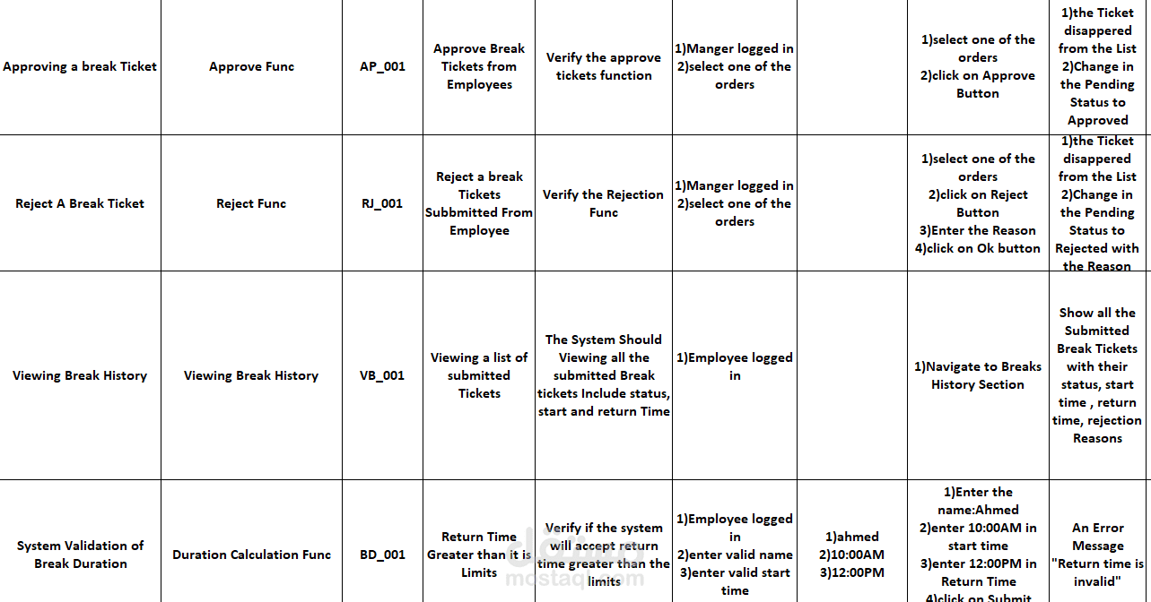 سجل الاستراحات (Break History): جدول تفصيلي لعرض الطلبات السابقة تشمل وقت البدء، وقت العودة، الحالة (Status)، وأي ملاحظات إضافية.