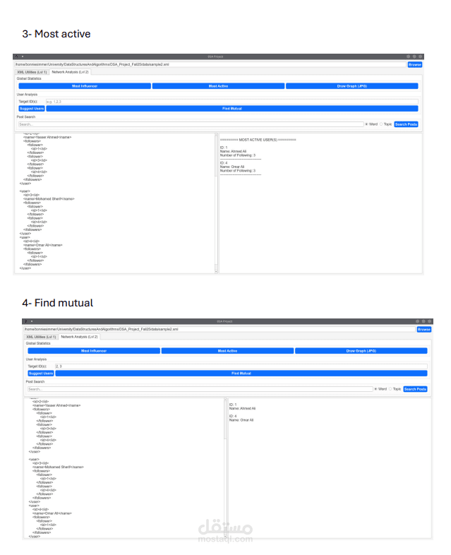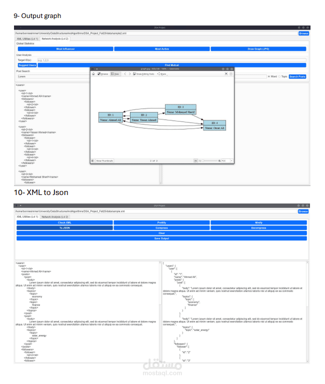 - تحليل الشبكات الاجتماعية: بناء نماذج بيانية (Graph-based adjacency) لاكتشاف المؤثرين، تجميع المجتمعات، تحديد المستخدمين النشطين، واقتراح الروابط الجديدة.