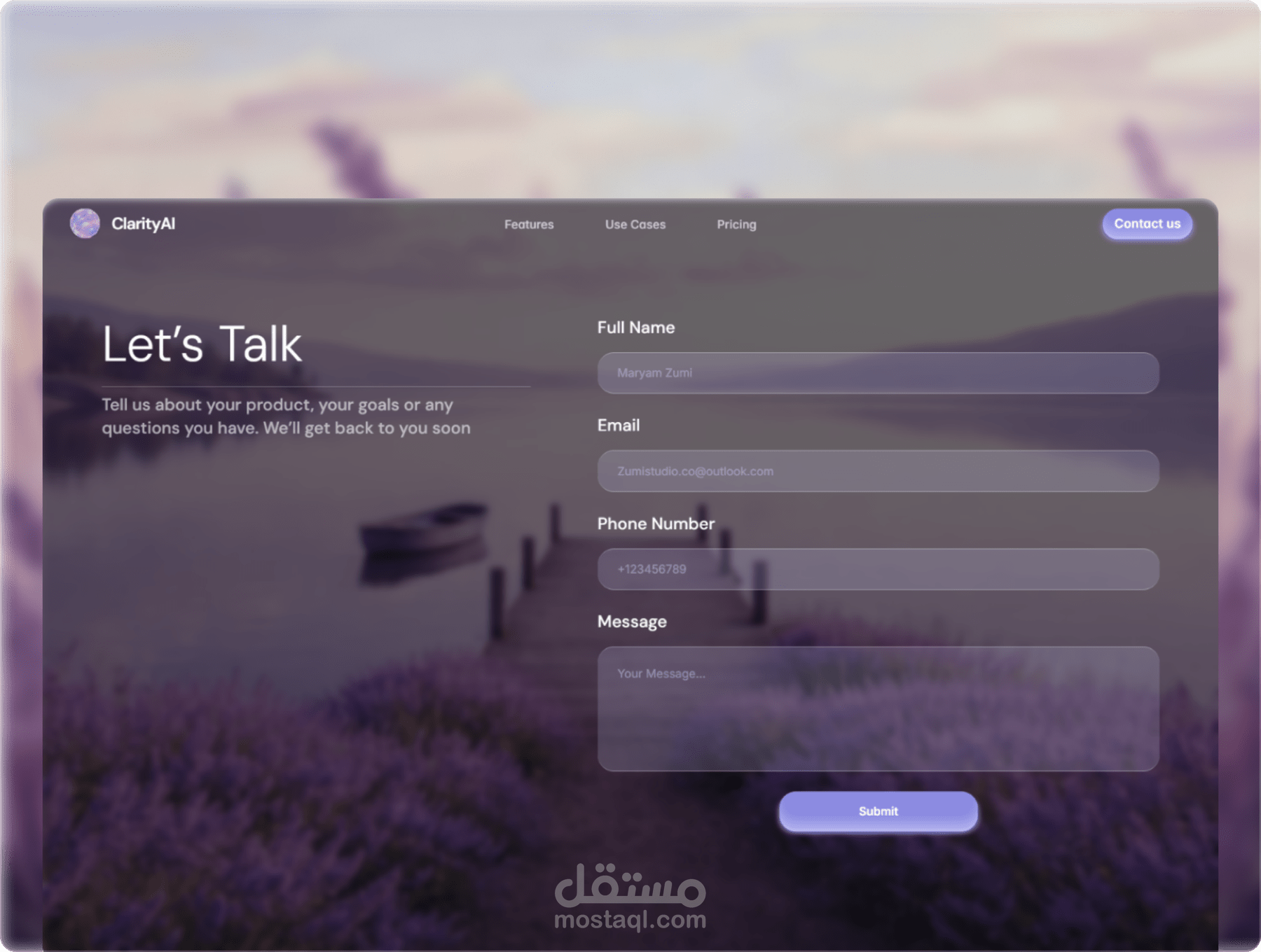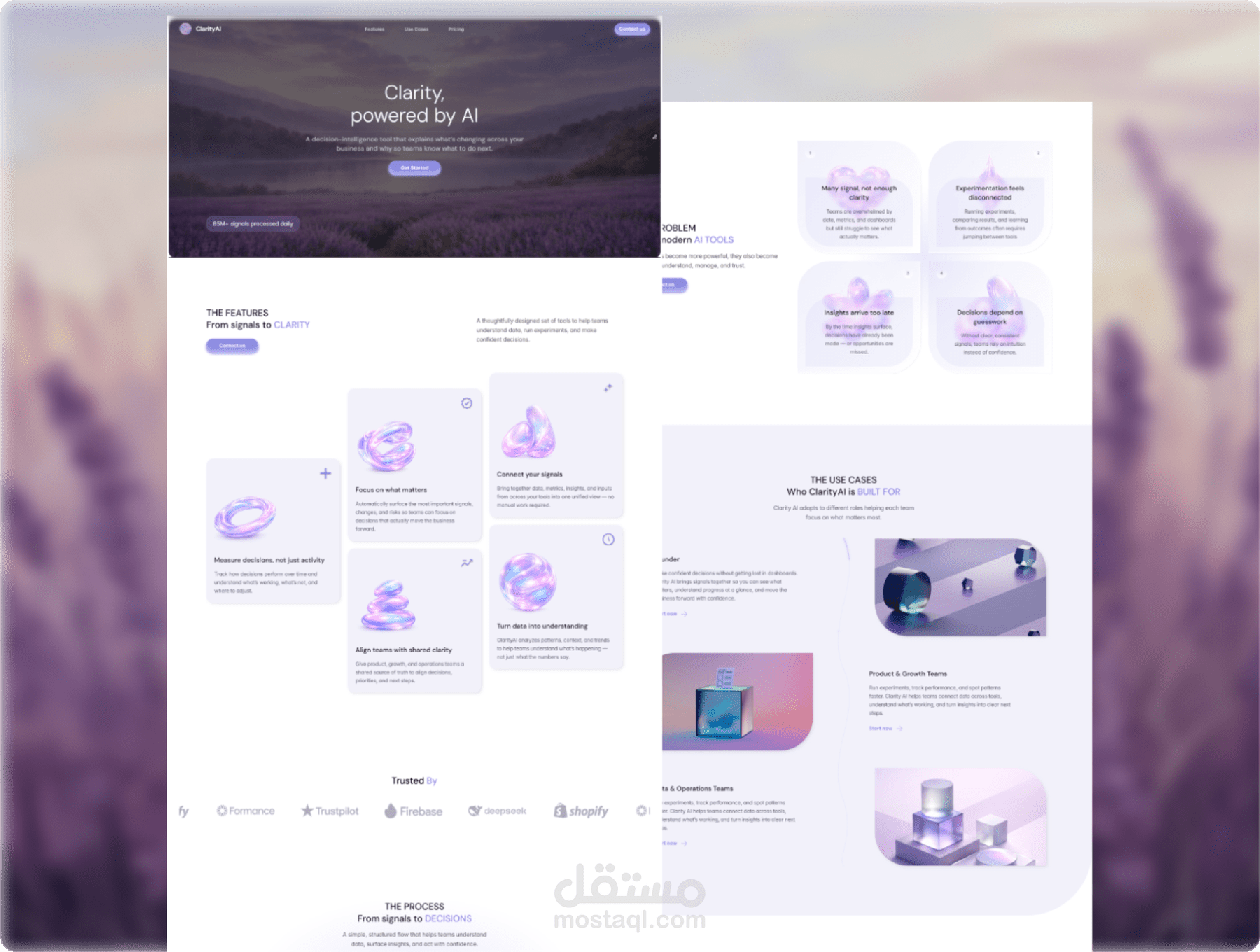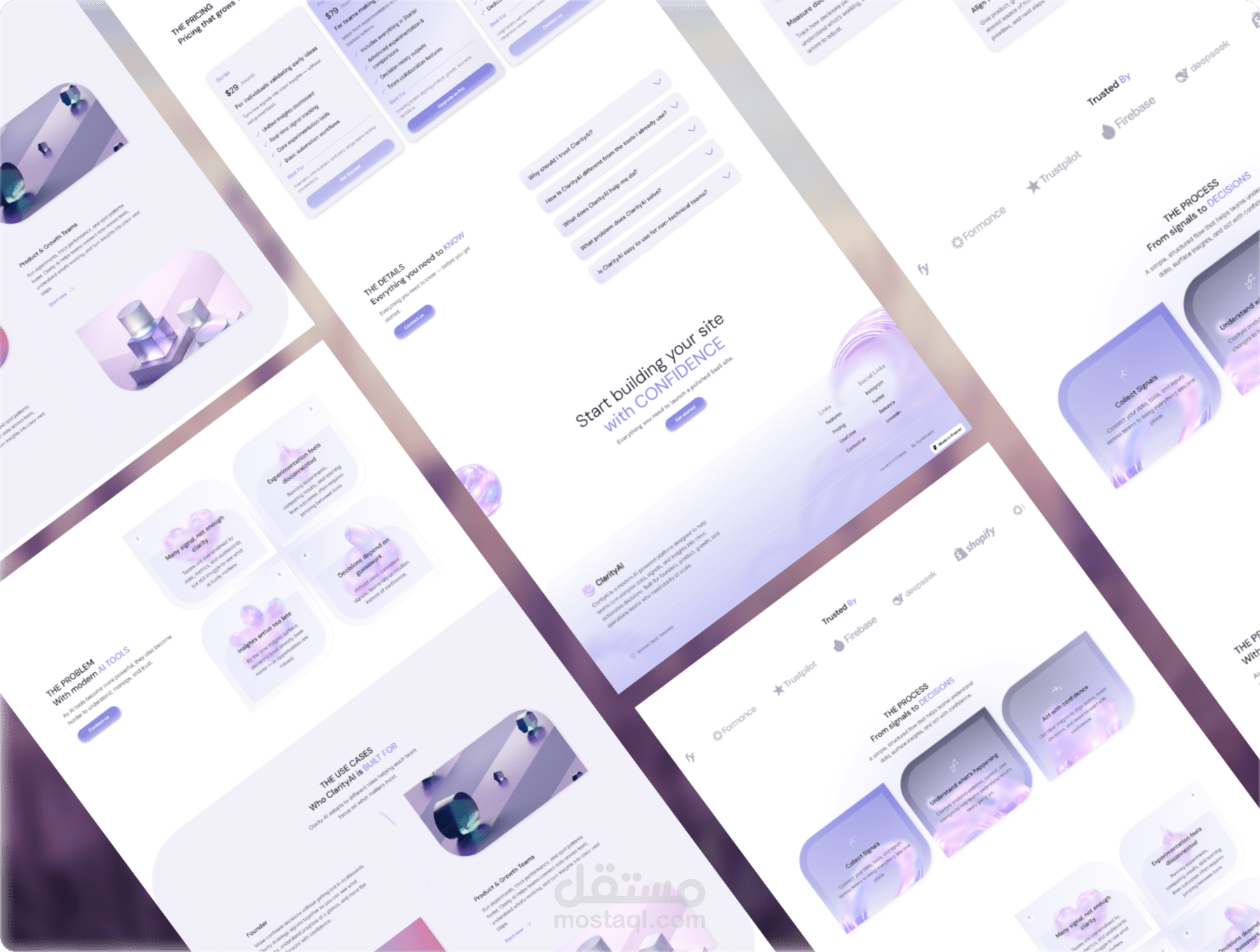 تم تصميم ClarityAI بأسلوب نظيف وحديث، مع نظام ألوان متوازن وتسلسل بصري مدروس يعزز تجربة المستخدم والتحويل.