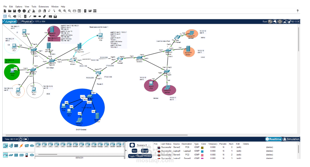 - تكوين الشبكات المحلية الافتراضية (VLANs) وربطها عبر Inter-VLAN Routing.