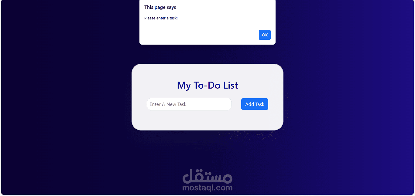 عند إضافة مهمة جديدة، يجب كتابة المهمة أولاً في حقل الإدخال، وفي حالة محاولة إضافة مهمة بدون كتابة نص، يظهر تنبيه (Alert) يطلب من المستخدم إدخال المهمة أولاً.