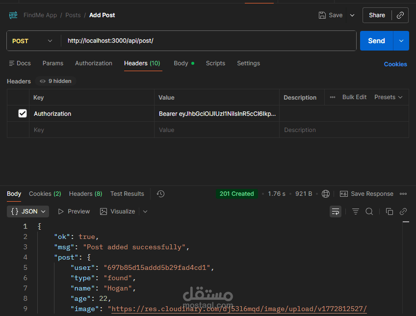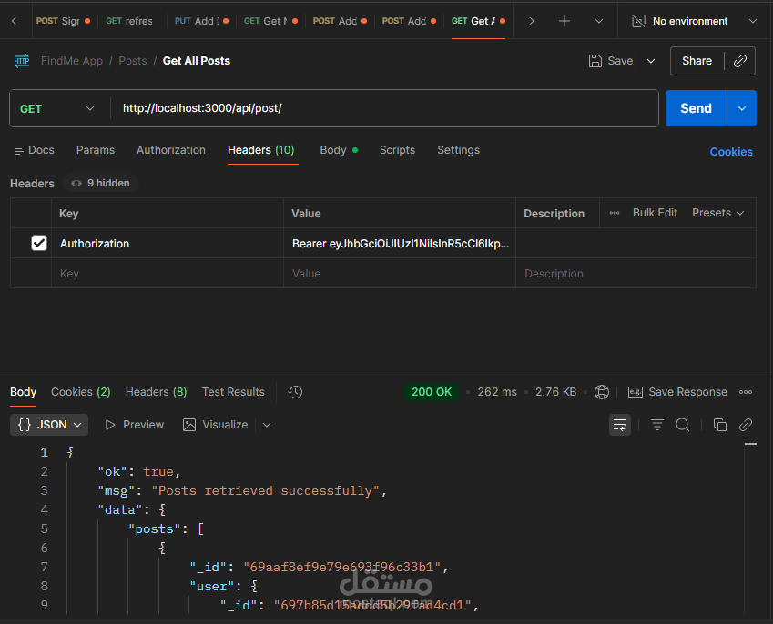 Backend متكامل لتطبيق مجتمعي يتضمن Auth شامل Signup Signin Refresh Logout مع دعم OTP و FaceBook Login بالإضافة لإدارة المستخدم والبوستات والتعليقات والإشعارات والشات تم بناء REST APIs منظمة وقابلة للتوسع مع تأمين باستخدام JWT وربط MongoDB