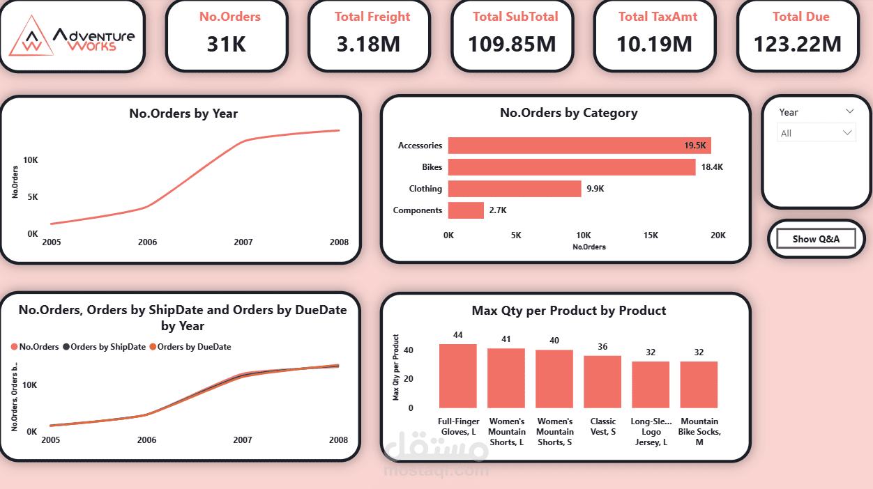 قمت بتصميم وتطوير لوحة معلومات تفاعلية باستخدام Power BI بالاعتماد على بيانات AdventureWorks بهدف تحليل أداء المبيعات ودعم اتخاذ القرار.