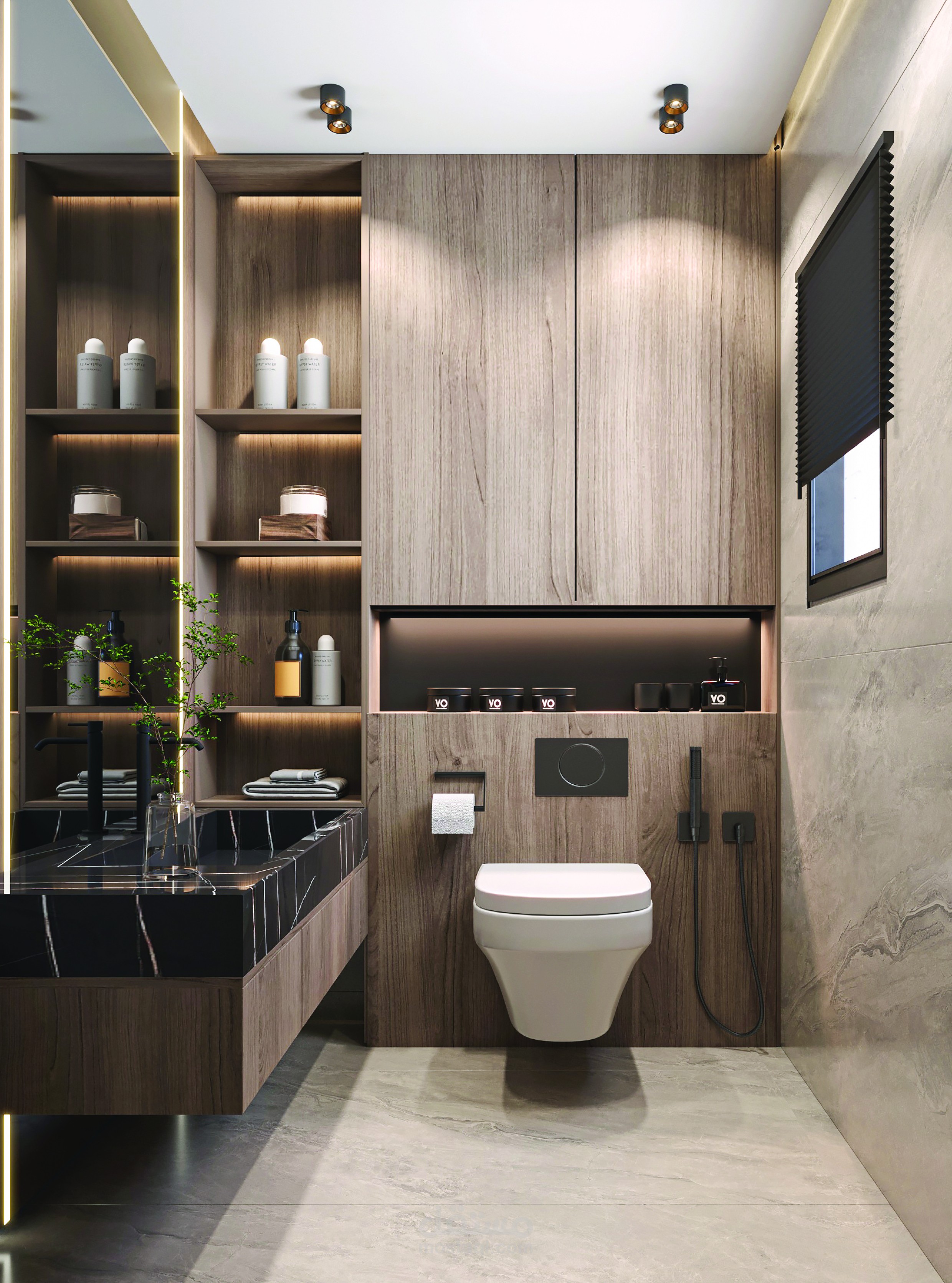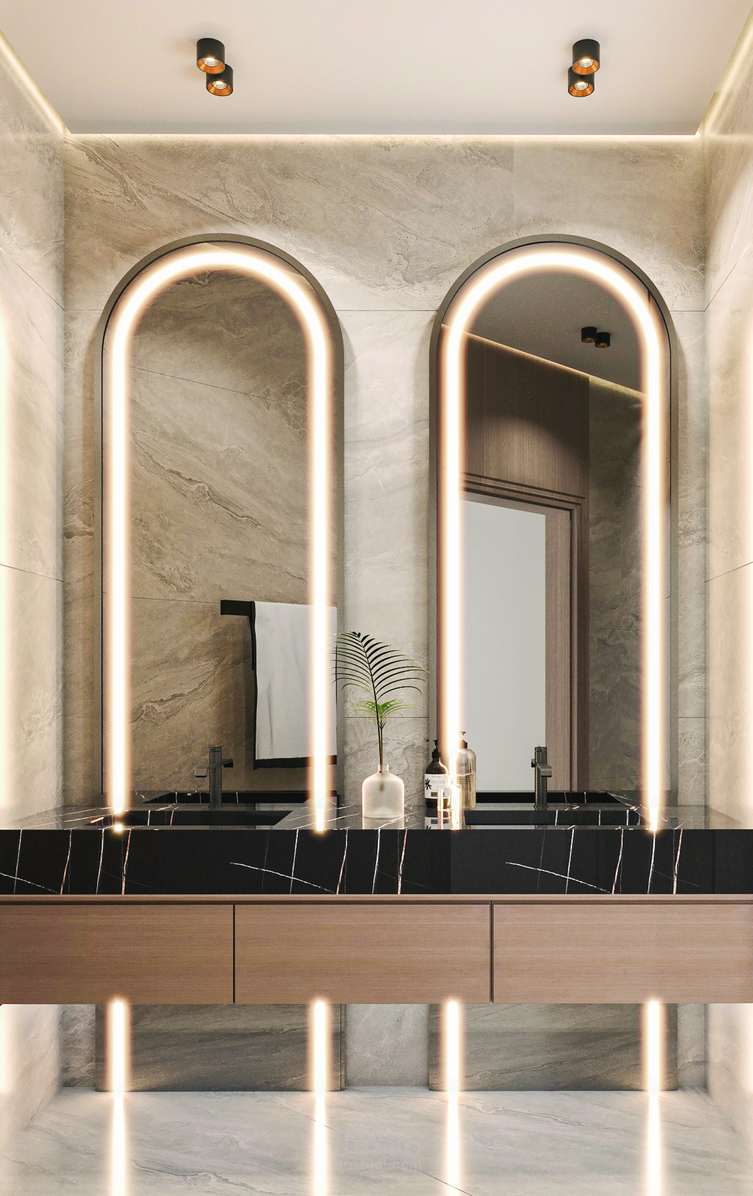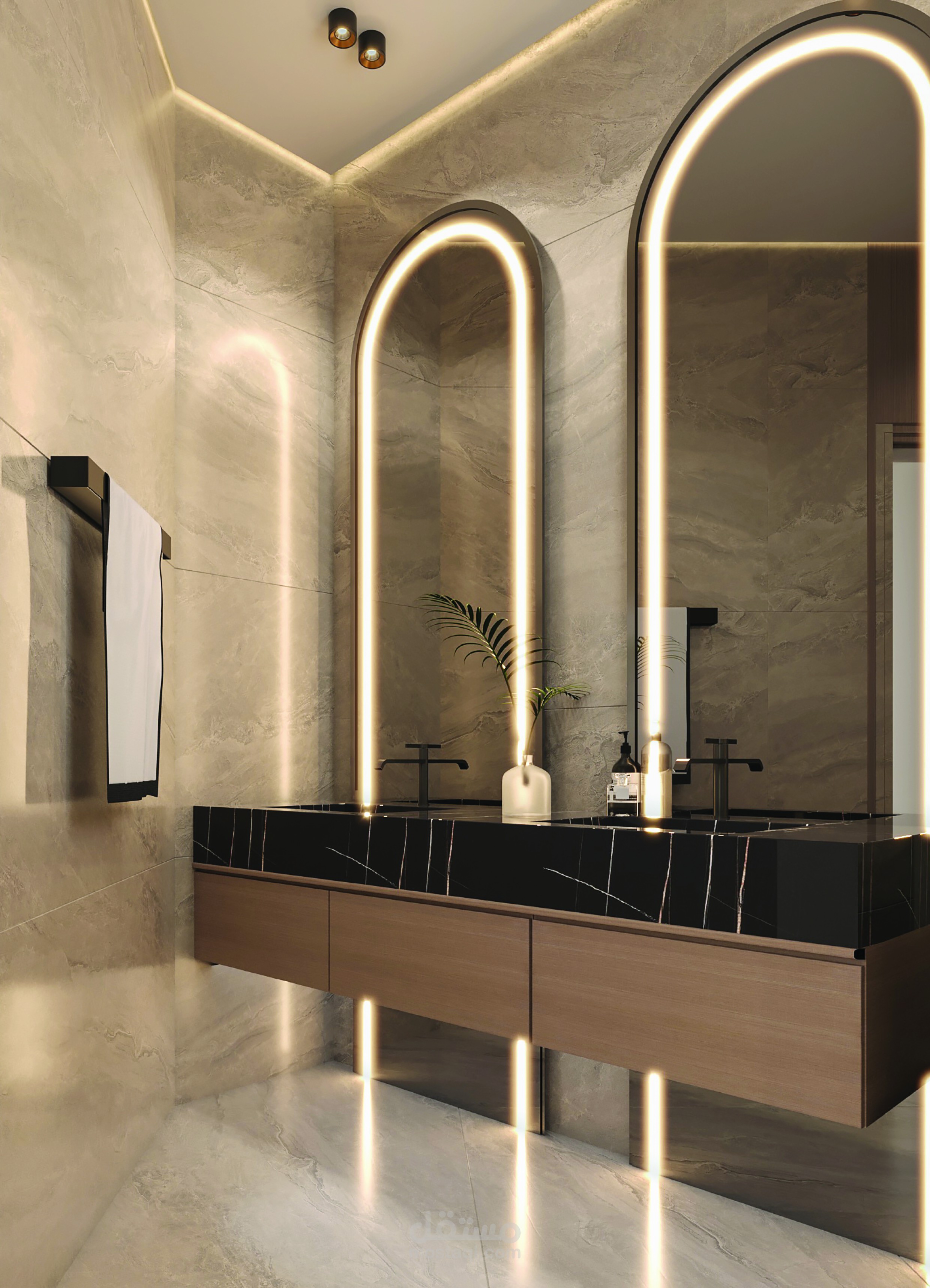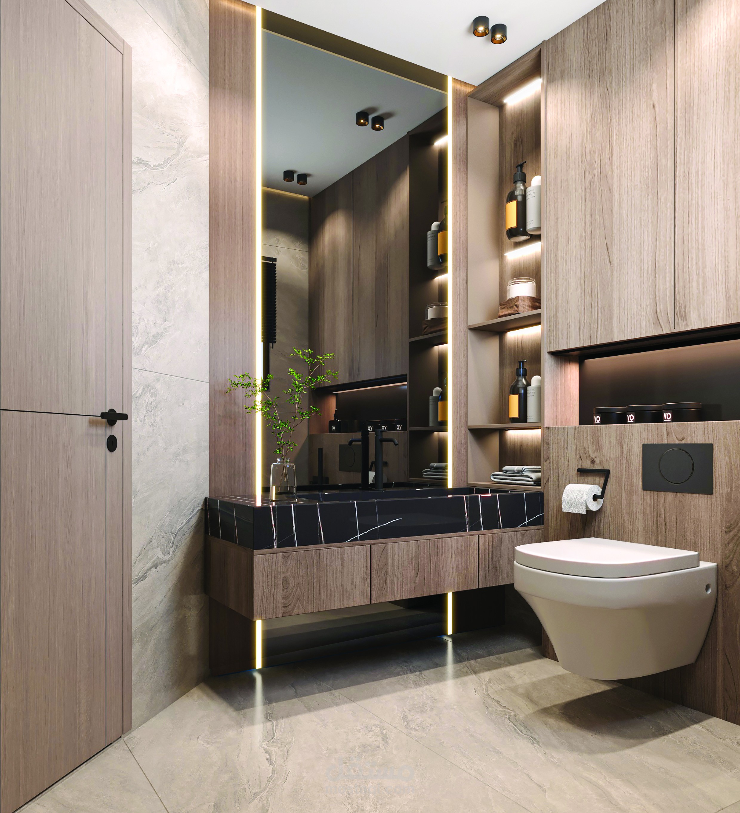 تنوع الخامات بين الحجر، الخشب، والرخام أضاف عمق بصري وأناقة واضحة، بينما الإضاءة المخفية حول المرايات وتحت الوحدات أعطت إحساسًا بالاتساع وتأثير عائم مميز.