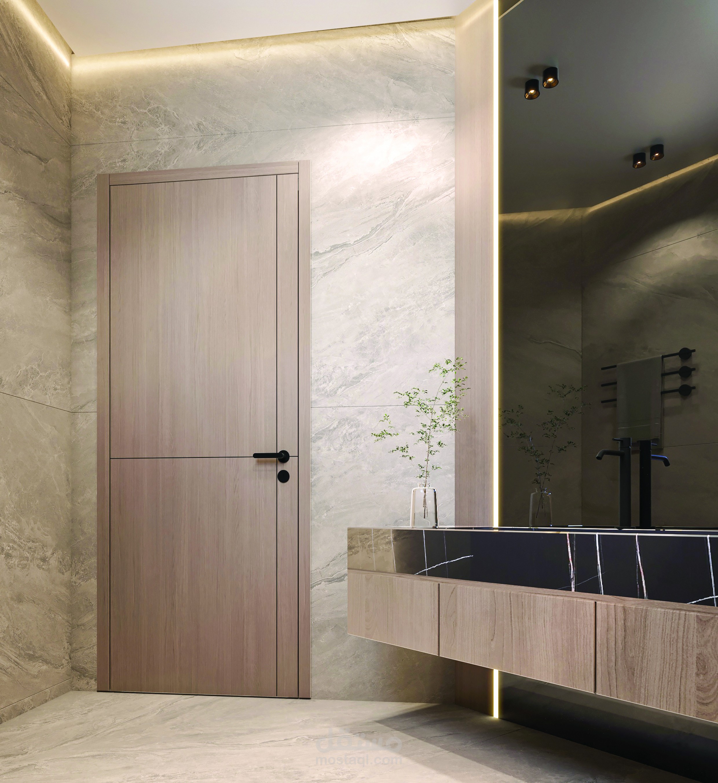 تم اختيار لوحة ألوان دافئة ومحايدة (بيج حجري + خشب طبيعي + رخام أسود بعروق بيضاء) لخلق توازن بين الفخامة والدفء، مع لمسات أسود مطفي تعزز الطابع العصري.