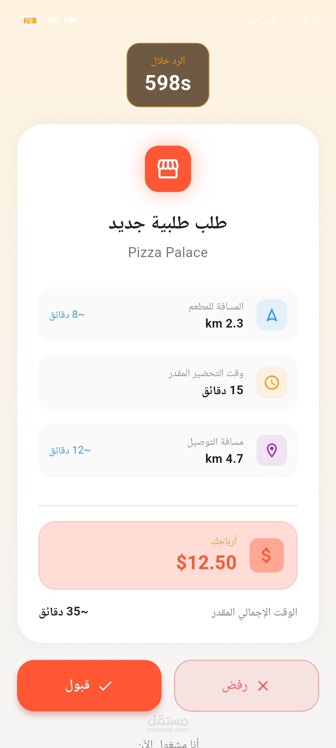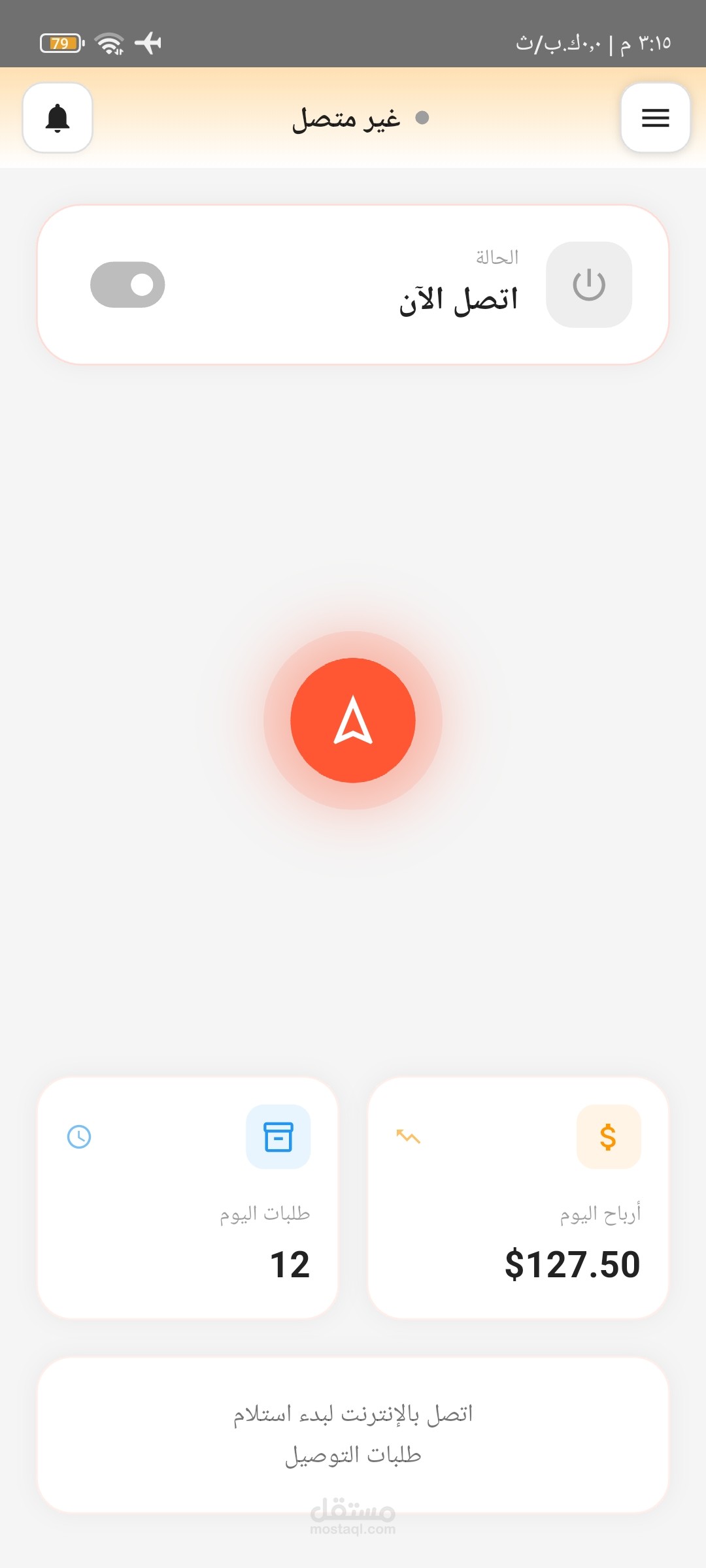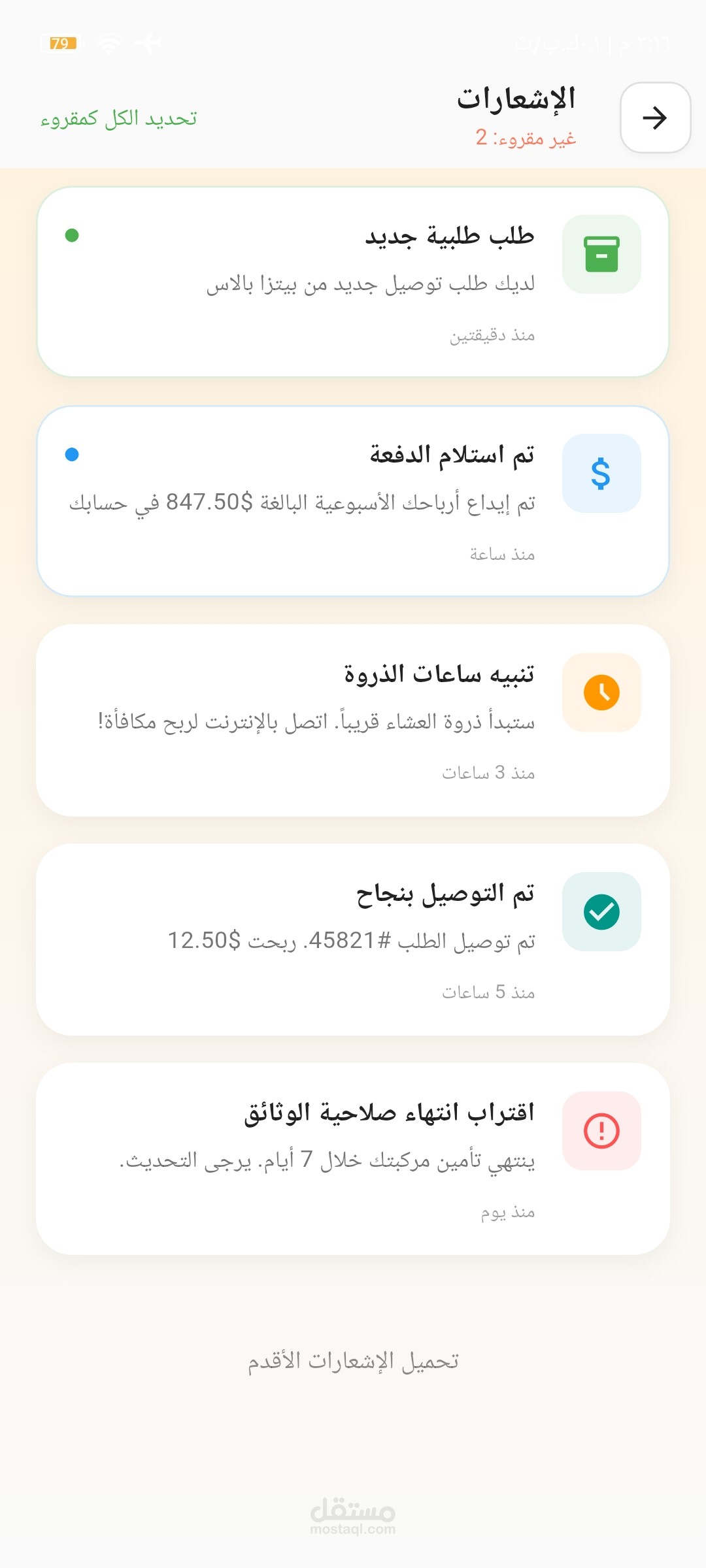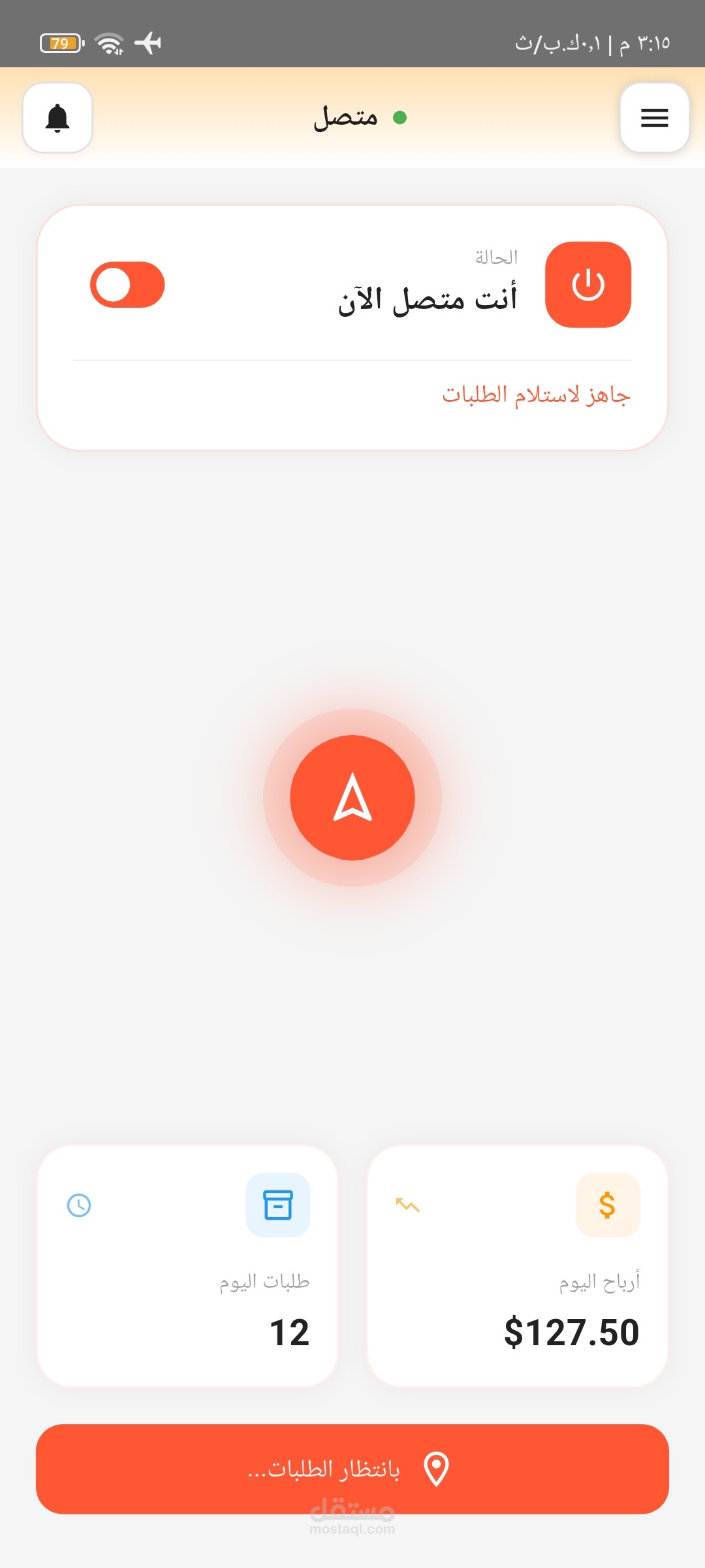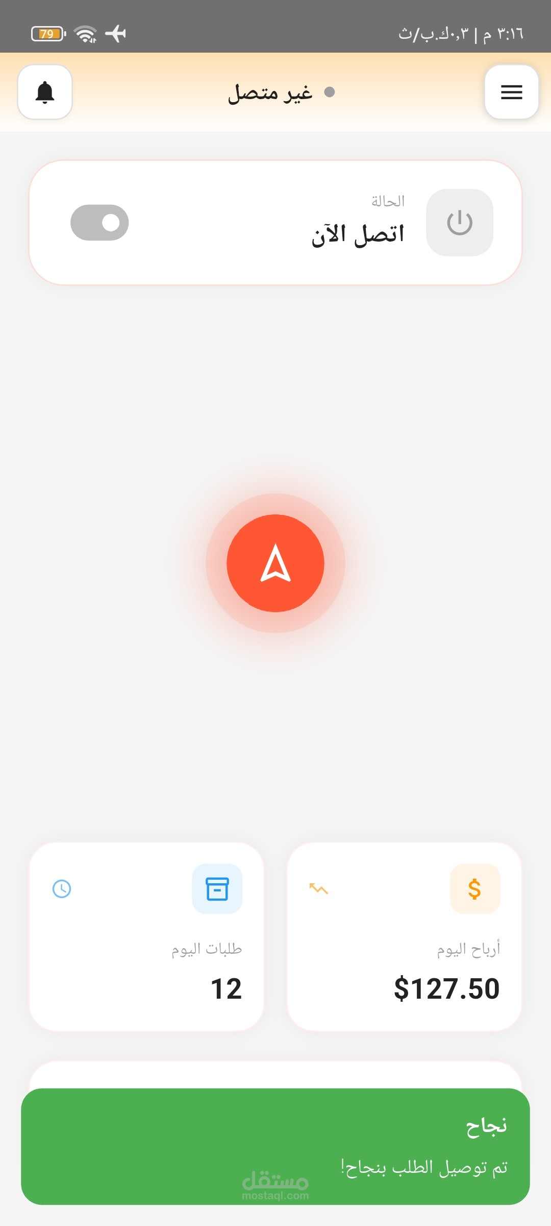 إشعارات لحظية: شاشة ونظام إشعارات متكامل (Push Notifications) لإبقاء السائق على إطلاع دائم بالطلبات الجديدة وتحديثات النظام.