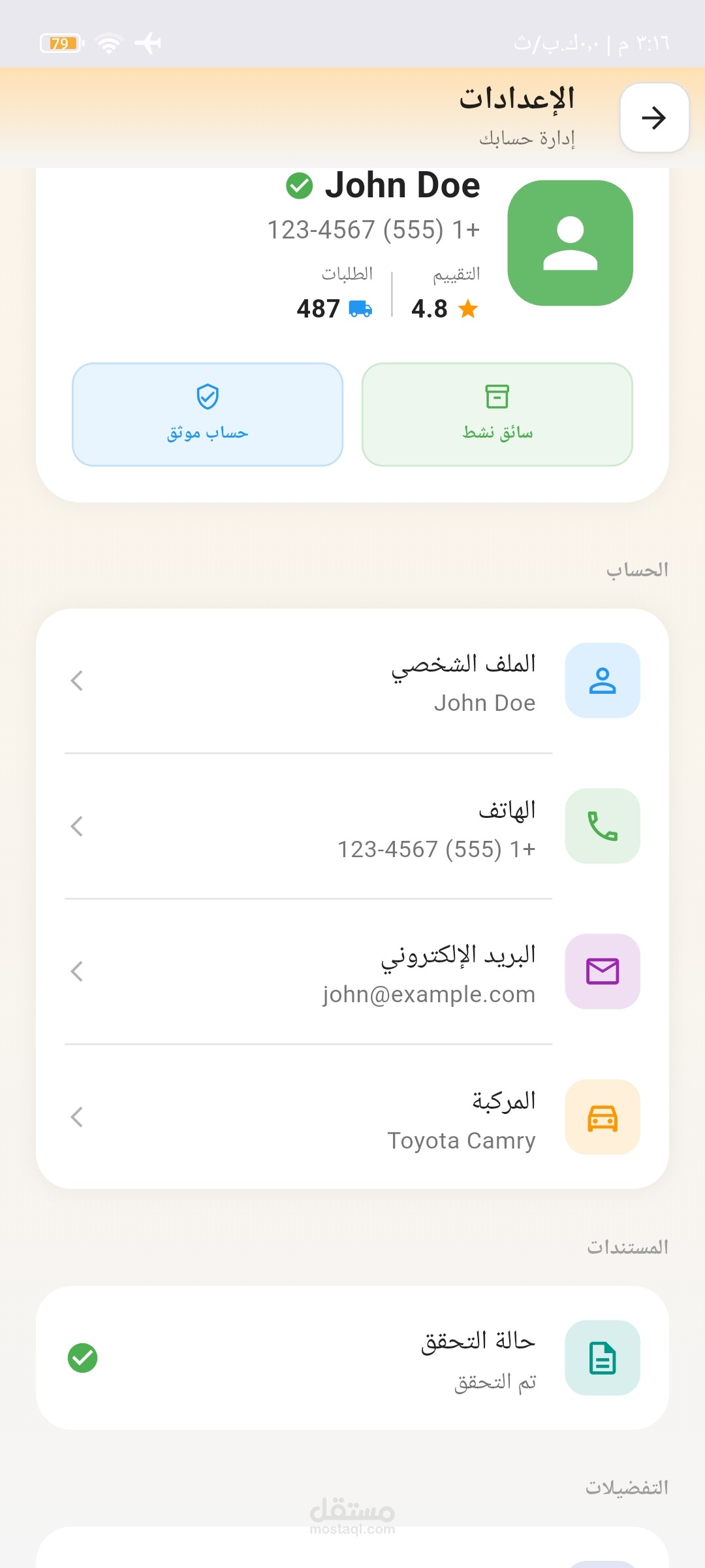 إعدادات مخصصة: شاشة إعدادات شاملة تتيح للسائق التحكم في تفضيلات حسابه وحالة اتصاله.