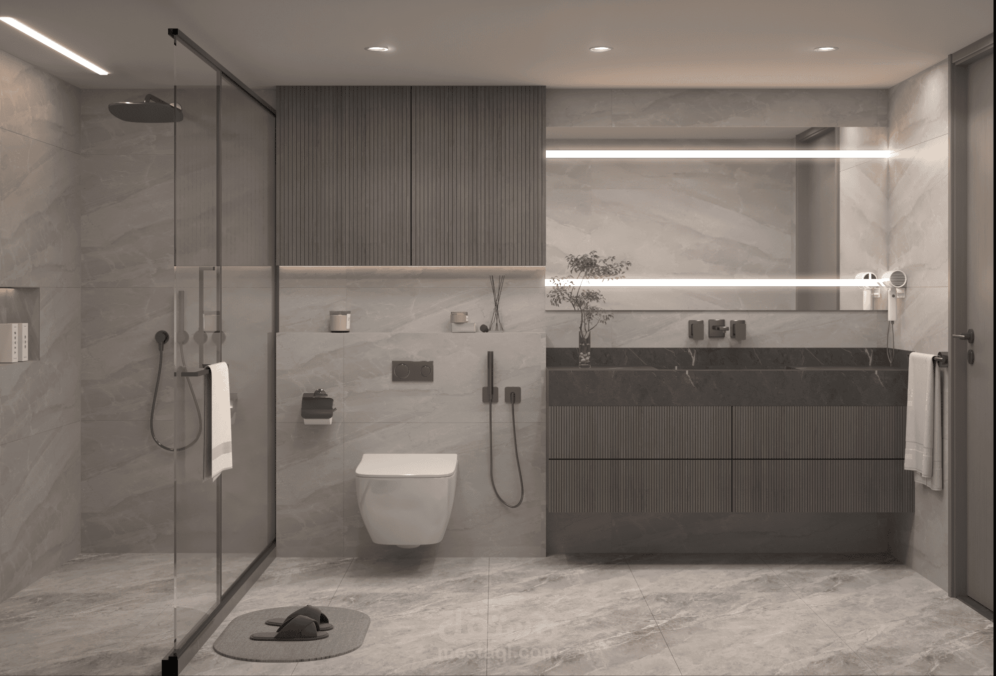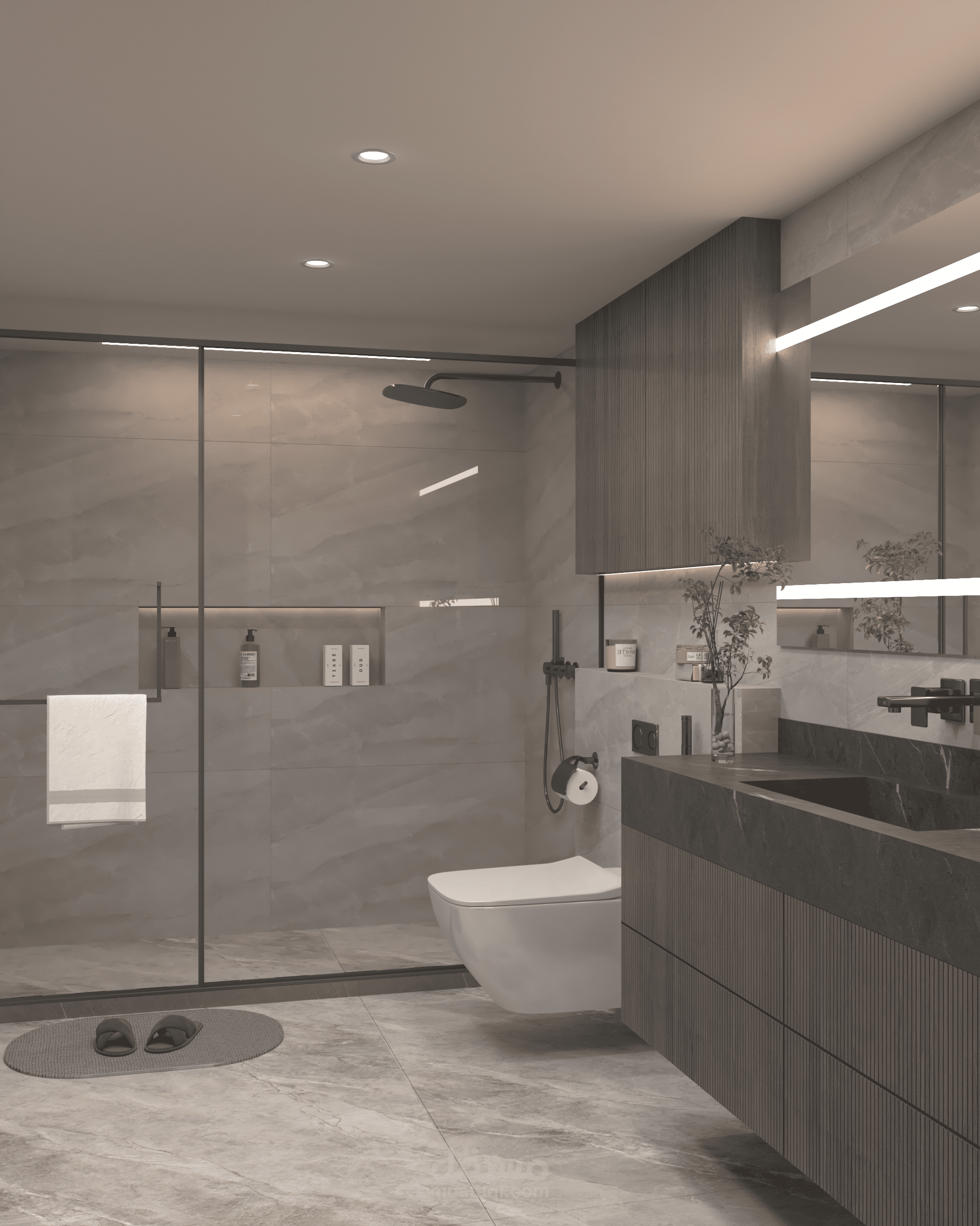 حمّام عصري يجمع بين البساطة الراقية والدقة في التفاصيل، مع اعتماد لوحة لونية حيادية تعزز الإحساس بالهدوء والاتساع.