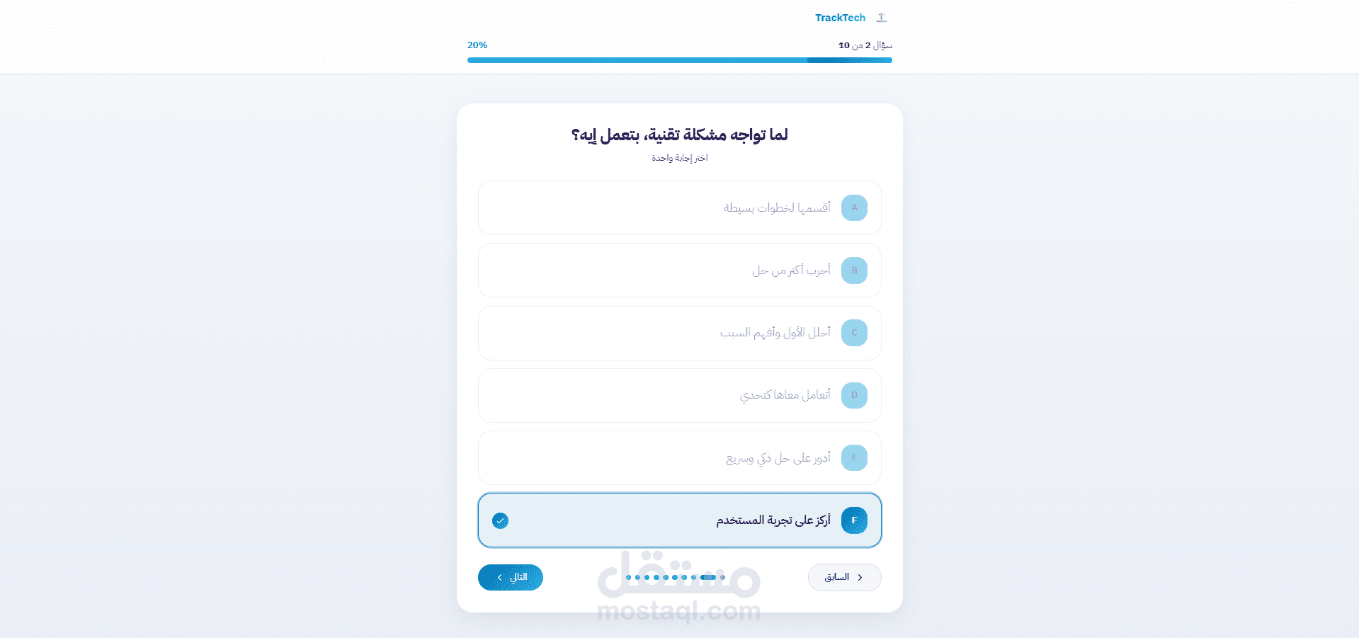 قمت بتطوير تطبيق ويب تفاعلي بنظام Quiz لتحديد المسار الدراسي الأنسب للمستخدم بناءً على إجاباته، مع نظام تتبع للبيانات وتخزين النتائج.