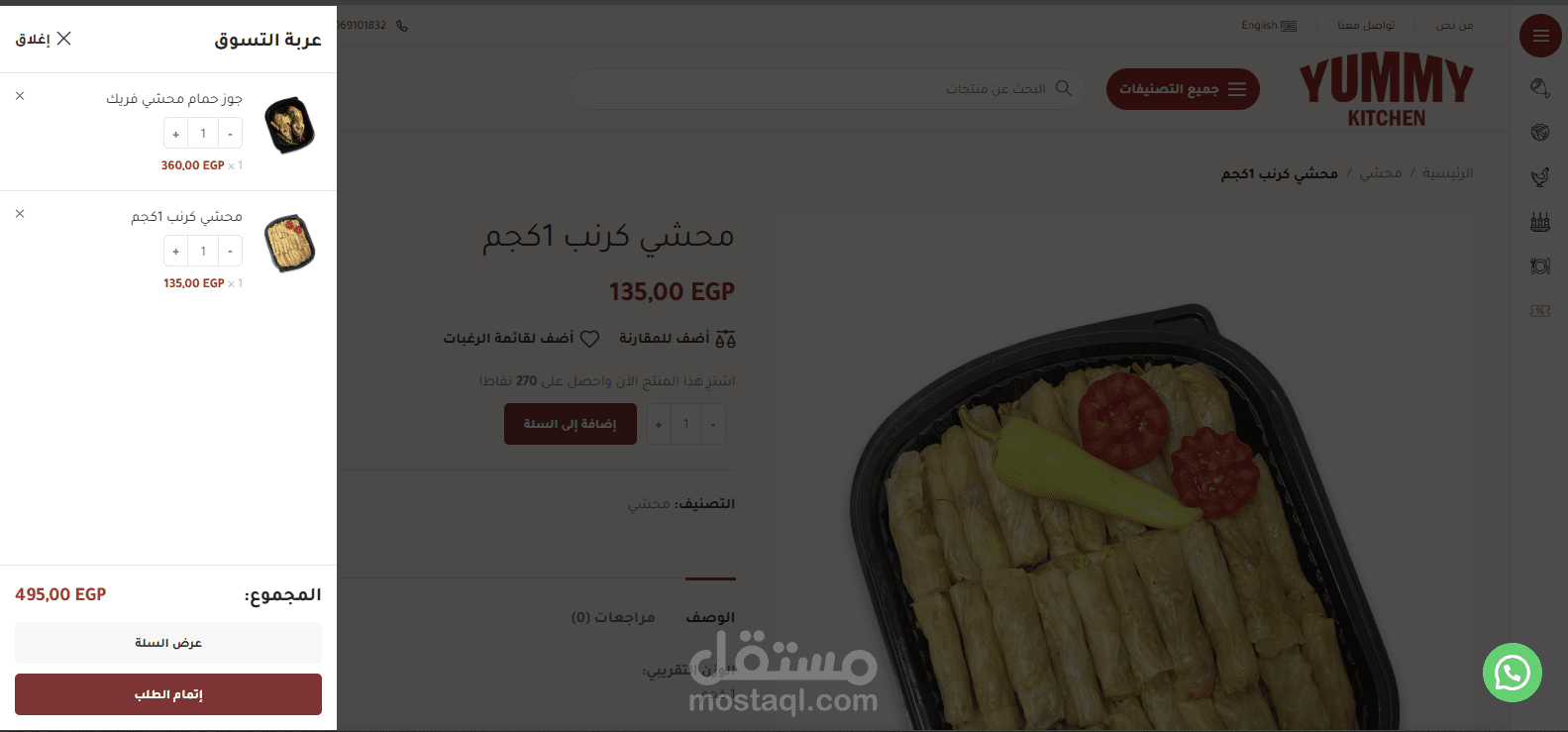 Yummy-Kitchen.com هو موقع تجارة إلكترونية متخصص في بيع ألذ الأطباق المنزلية والوجبات الجاهزة التي يمكن للعميل إضافتها إلى السلة وطلبها أونلاين (تسليم أو توصيل، حسب النظام المستخدم). المنتجات تشمل أصناف متعددة من الأطعمة المنزلية التقليدية والمقبلات والمشاوي وغيرها.