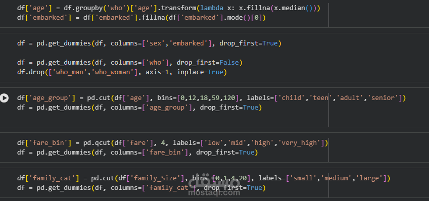 تجهيز البيانات وإنشاء Dummy Variables (sex, embarked, who, age_group, fare_bin, family_cat)