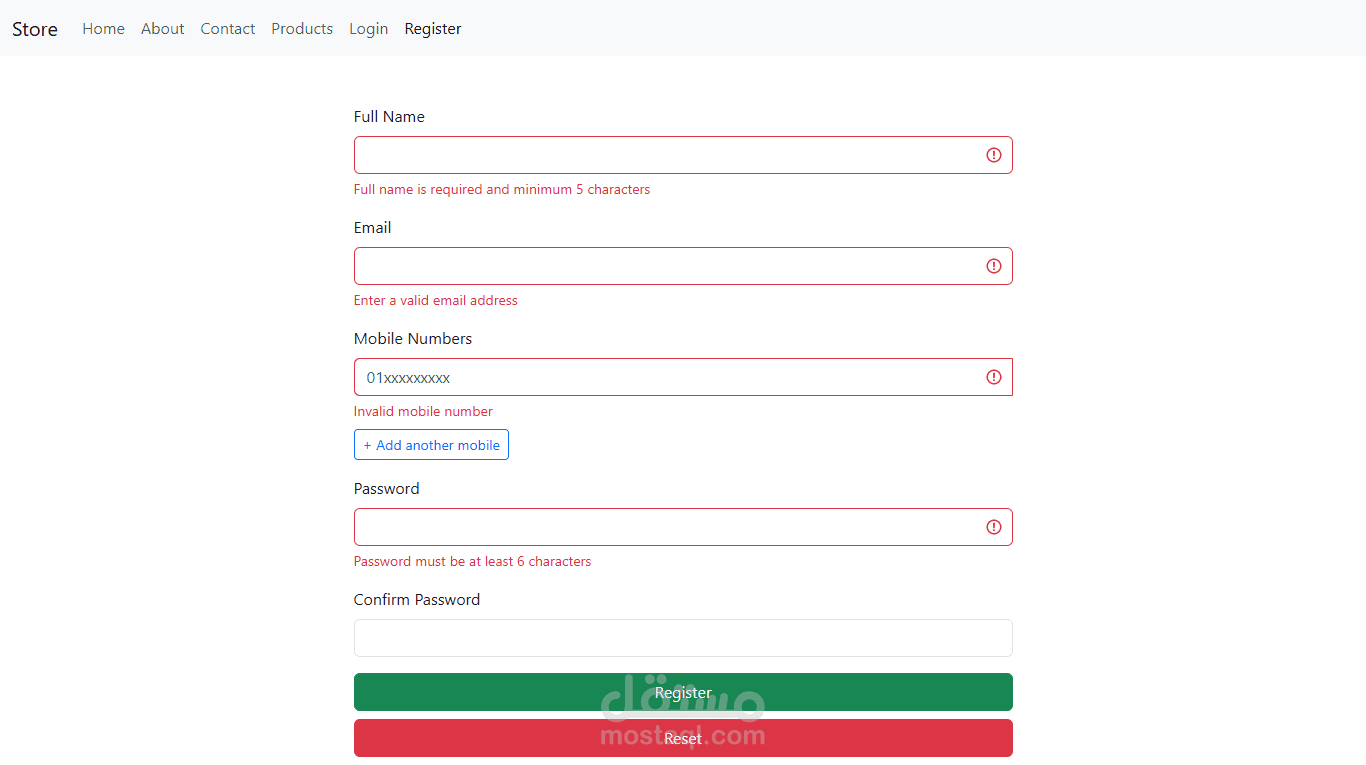 نظام التحقق من البيانات (Form Validation): صفحة تسجيل مستخدمين (Register) تحتوي على نظام تحقق لحظي (Reactive Forms) لضمان إدخال البيانات بشكل صحيح (مثل البريد الإلكتروني، طول كلمة السر، وأرقام الهاتف).