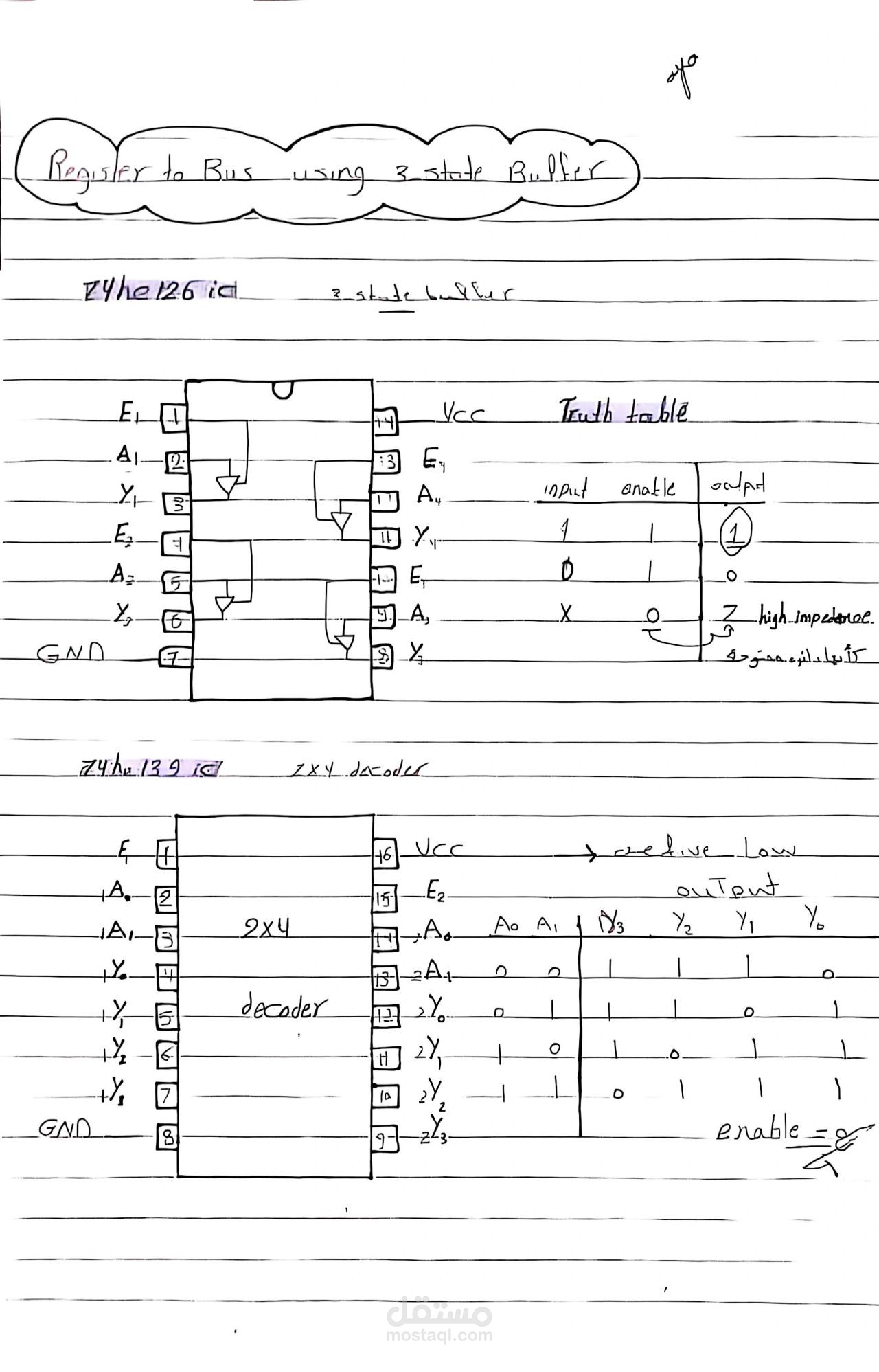 يهدف هذا المشروع إلى تصميم نظام نقل بيانات بين مجموعة من المسجلات عبر **ناقل مشترك (Bus)** باستخدام **3-State Buffer** لضمان انتقال البيانات بشكل آمن دون حدوث تعارض. يعتمد النظام على فكرة أن الـ 3-State Buffer يعمل بثلاث حالات (0، 1، و High-Impedance)، مما يسمح لمسجل واحد فقط بالتحكم في الناقل في كل لحظة ويمنع حدوث تصادم في الإشارات.