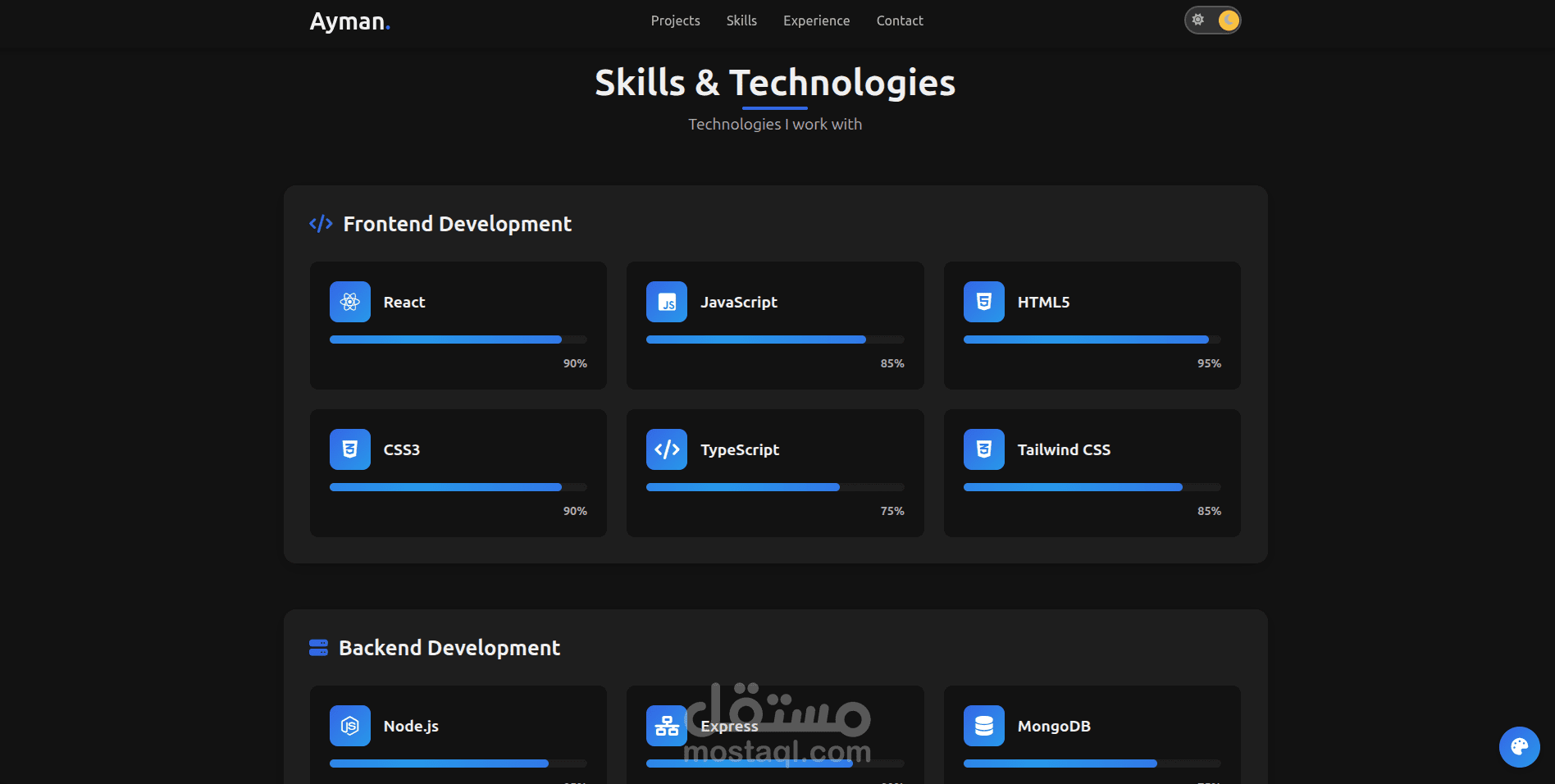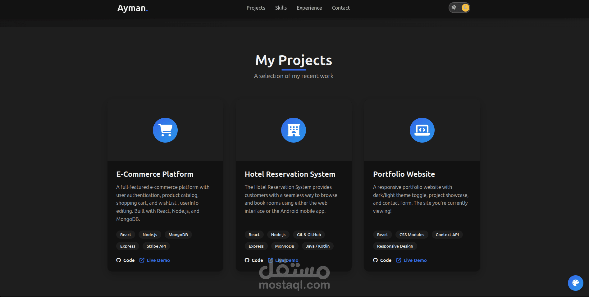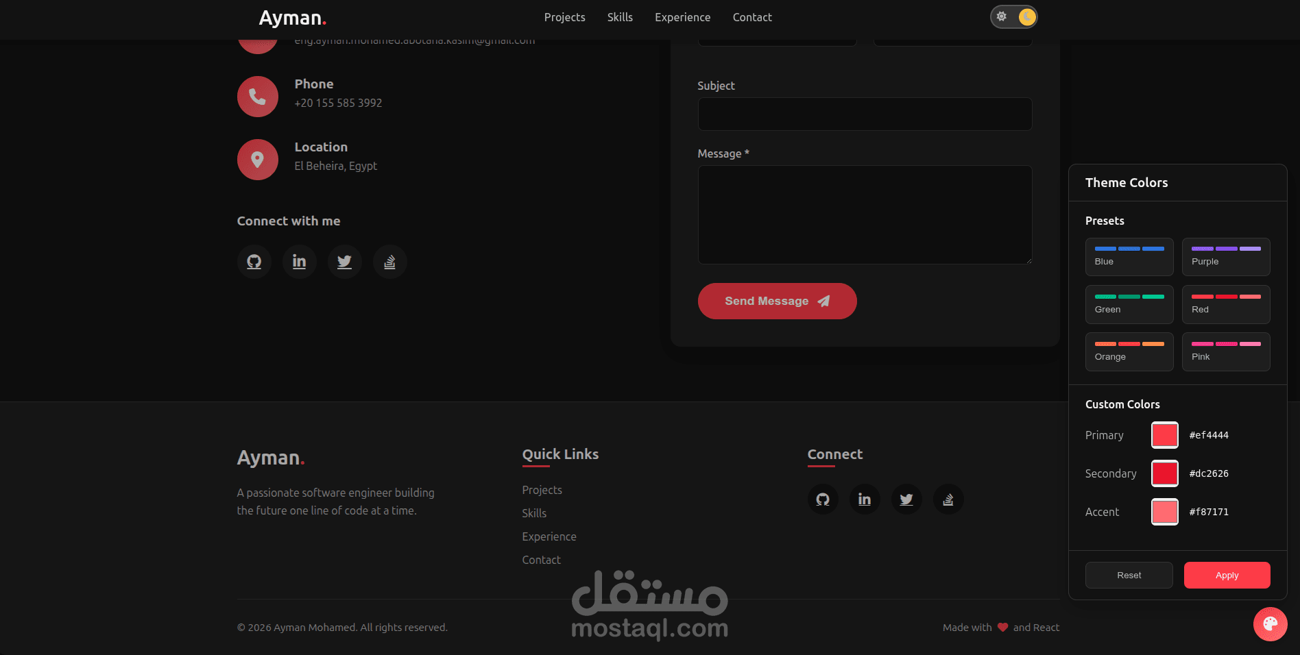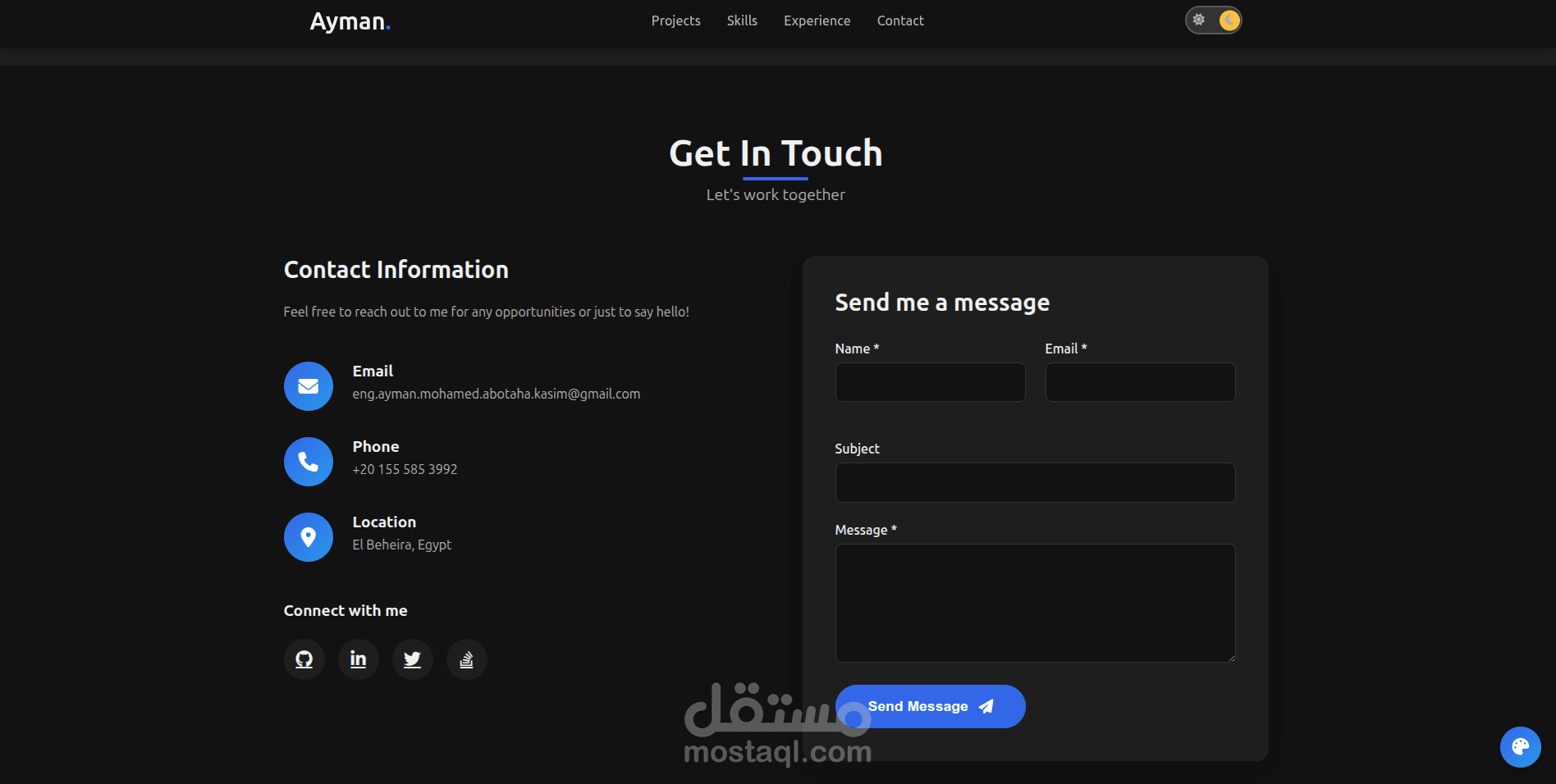 الموقع مصمم ليعكس الهوية التقنية للمطور ويوفر تجربة مستخدم سلسة مع دعم الوضعين الليلي والفاتح (Dark / Light Mode).