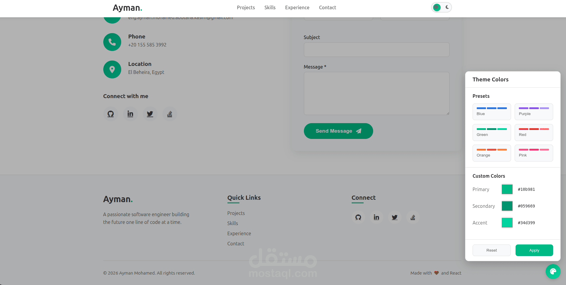 قمت بتطوير موقع بورتفوليو شخصي احترافي باستخدام React 18 لعرض المهارات، المشاريع، والخبرات العملية بأسلوب عصري ومتجاوب بالكامل مع جميع الأجهزة.