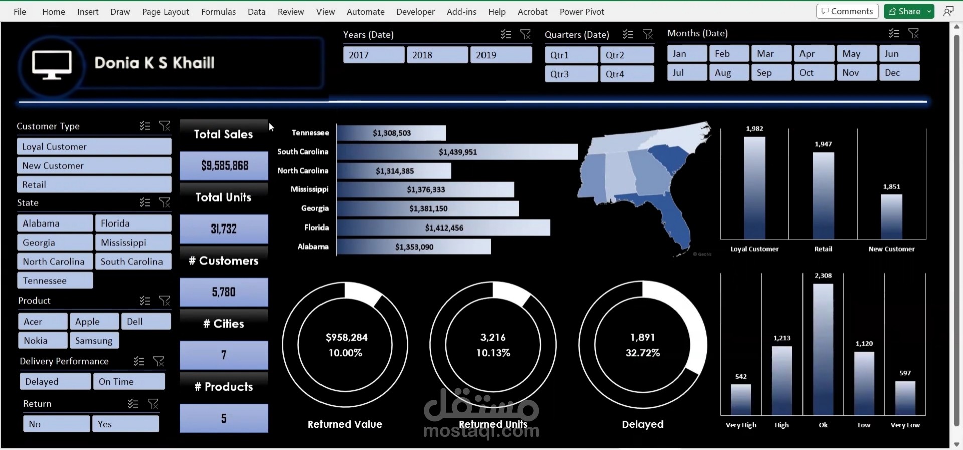استخدام Slicers وتحليل بيانات الشحن (Delayed vs On Time)وربطها بمعدل المرتجعات