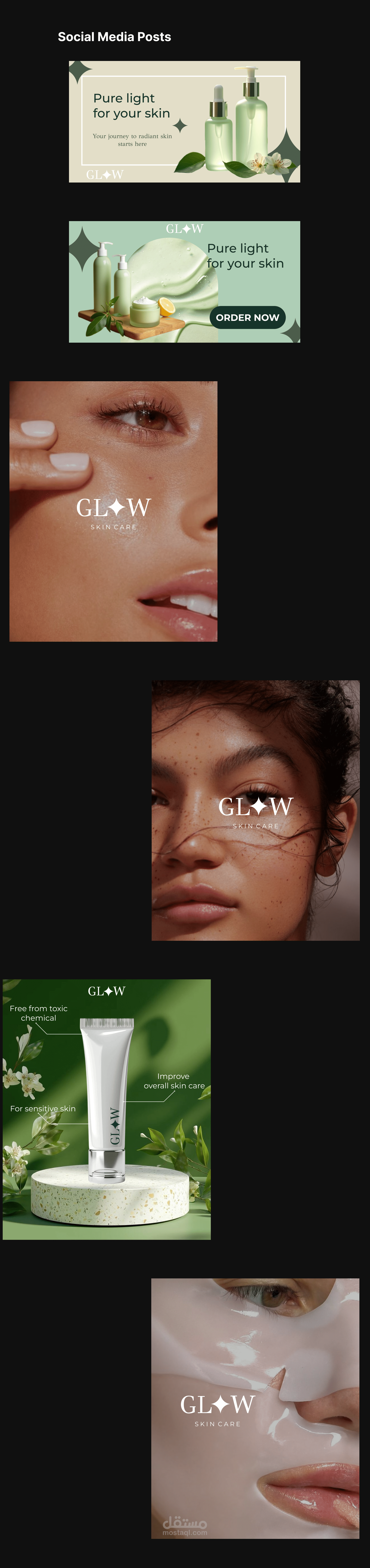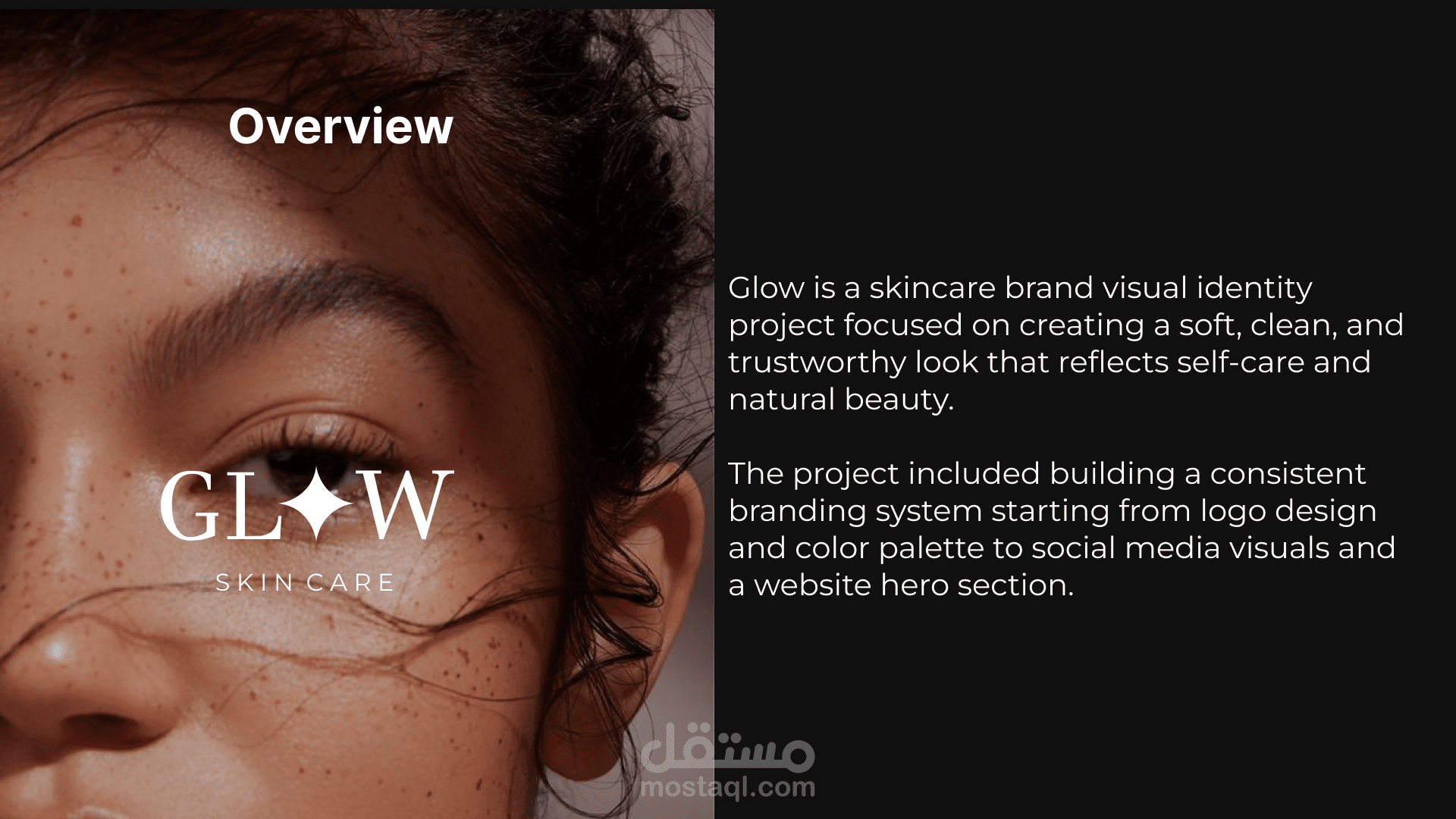 Glow هو مشروع تصميم هوية بصرية لعلامة سكين كير يركز على إظهار إحساس النعومة والنظافة والثقة بما يعكس العناية الذاتية والجمال الطبيعي.