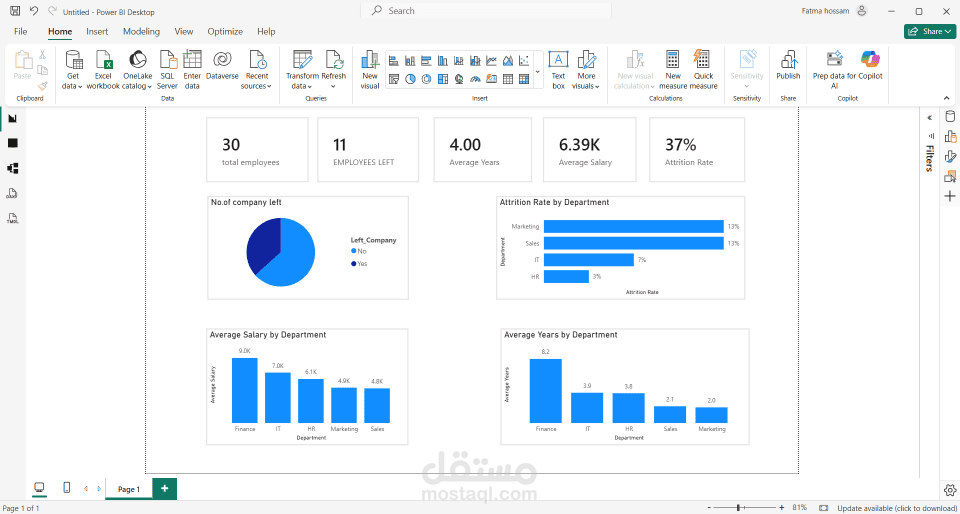 هذه dashboard يحلل استقالات الموظفين لتحديد الأنماط في ترك العمل عبر الأقسام، المستويات الوظيفية، والرواتب. الهدف هو تقديم رؤى تساعد على تحسين الاحتفاظ بالموظفين والتخطيط للقوى العاملة.