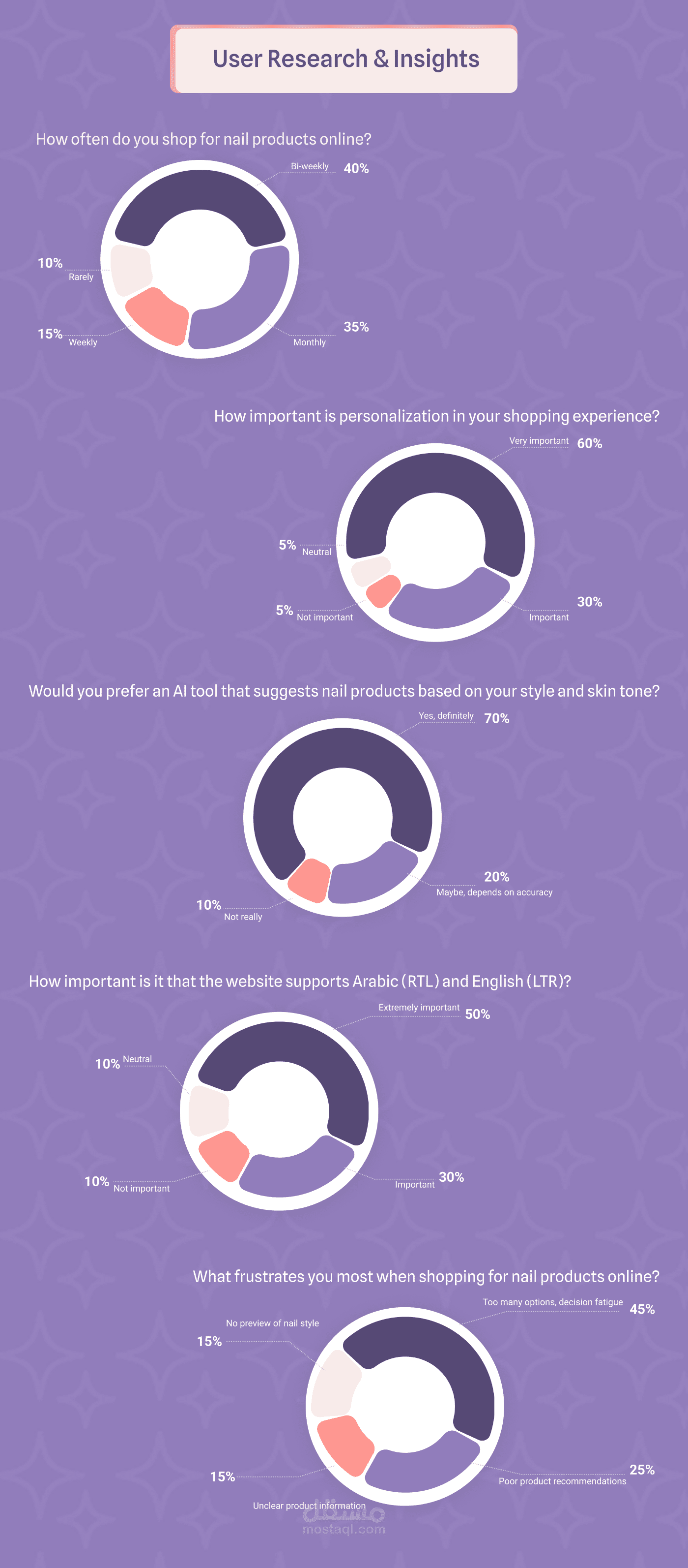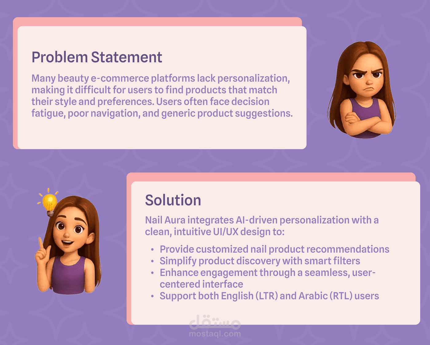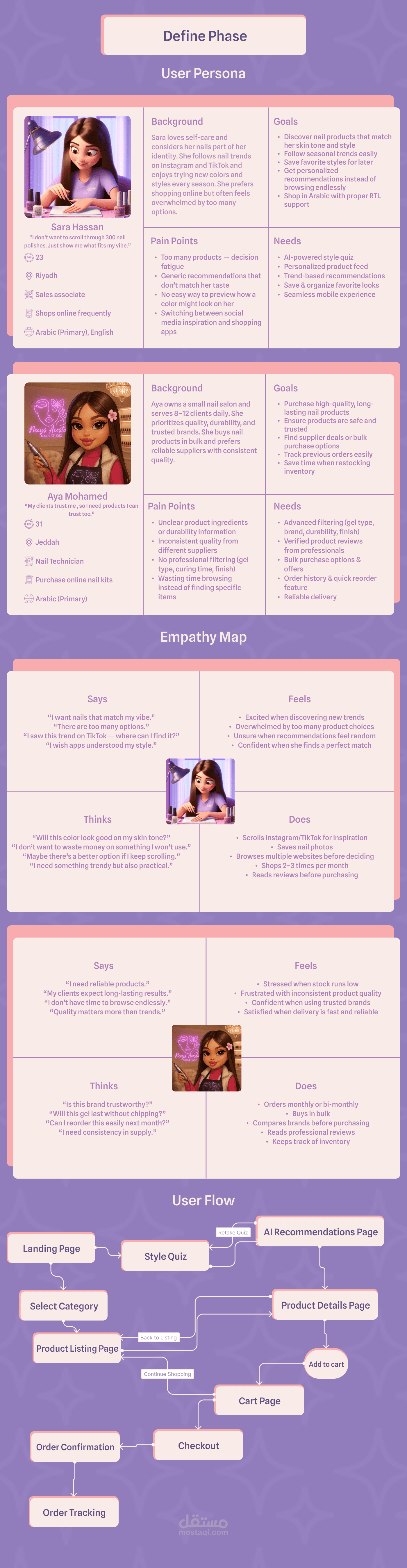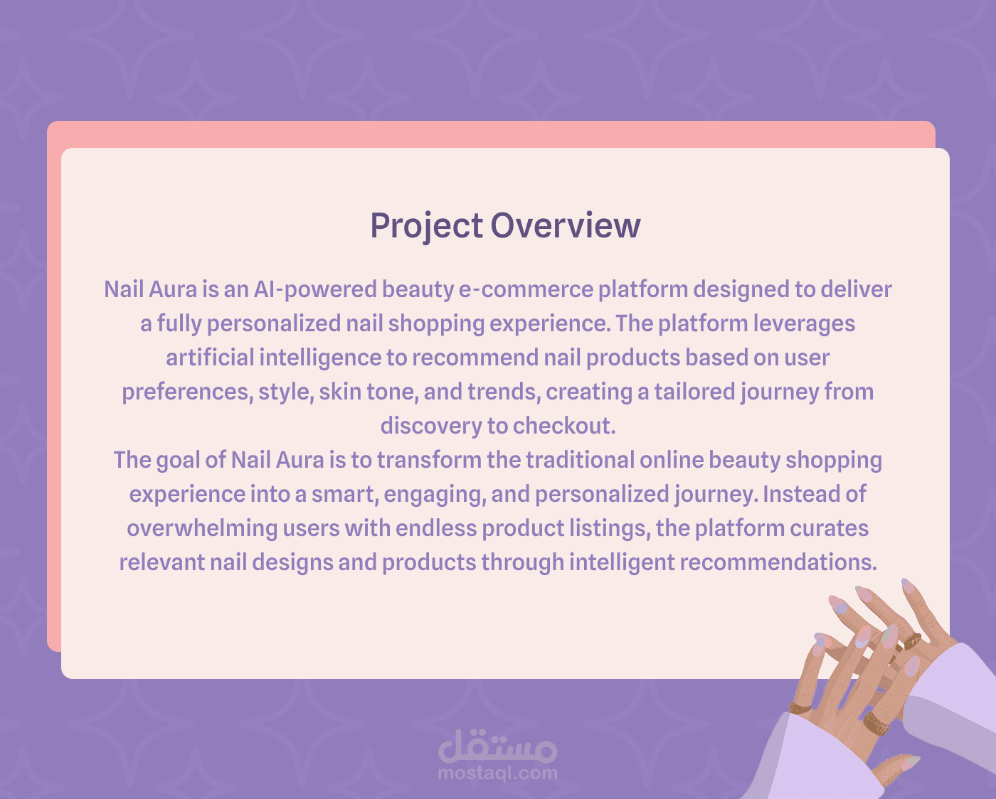 توفر Nail Aura تجربة سلسة تبدأ من اكتشاف “الأورا” الخاصة بك، مرورًا بتصفح المنتجات بتصنيفات واضحة، وصولًا إلى إتمام الطلب بسهولة وسرعة. الهدف هو تحويل رحلة اختيار منتجات الأظافر من تجربة عشوائية إلى تجربة ذكية، ممتعة، ومخصصة بالكامل لكل مستخدمة.