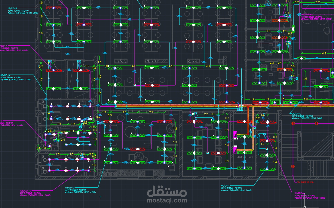 مراجعة مستويات الإضاءة وتوزيع المفاتيح والتحكم طبقًا للكود والمواصفات الفنية، مع تنسيق الأعمال مع التخصصات الأخرى لضمان عدم التعارض (Clash Detection).