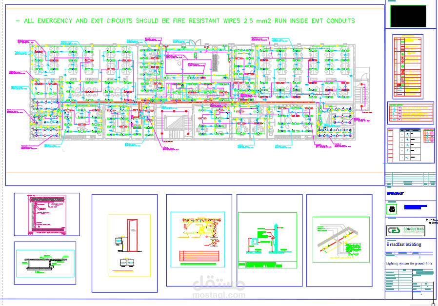 إعداد اللوحات التنفيذية (Lighting Shop Drawings) للدور الأرضي، متضمنة توزيع وحدات الإضاءة طبقًا للمخططات المعمارية، وتحديد مسارات الدوائر الكهربائية، وأرقام الدوائر (Circuiting) وربطها باللوحات الكهربائية.