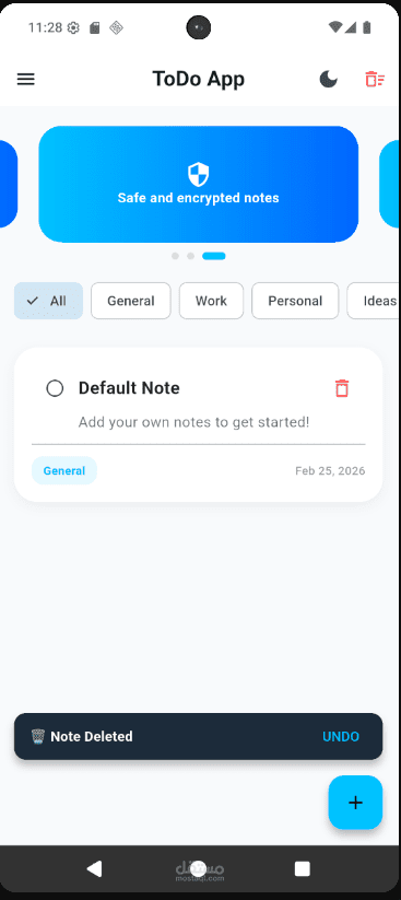 بُني التطبيق باستخدام Flutter، ويُظهر هندسة نظيفة وإدارة حالة وتخزين بيانات محلي، مما يجعله قاعدة مثالية للعملاء المستقلين الذين يحتاجون إلى تطبيق مهام أو ملاحظات قابل للتخصيص.