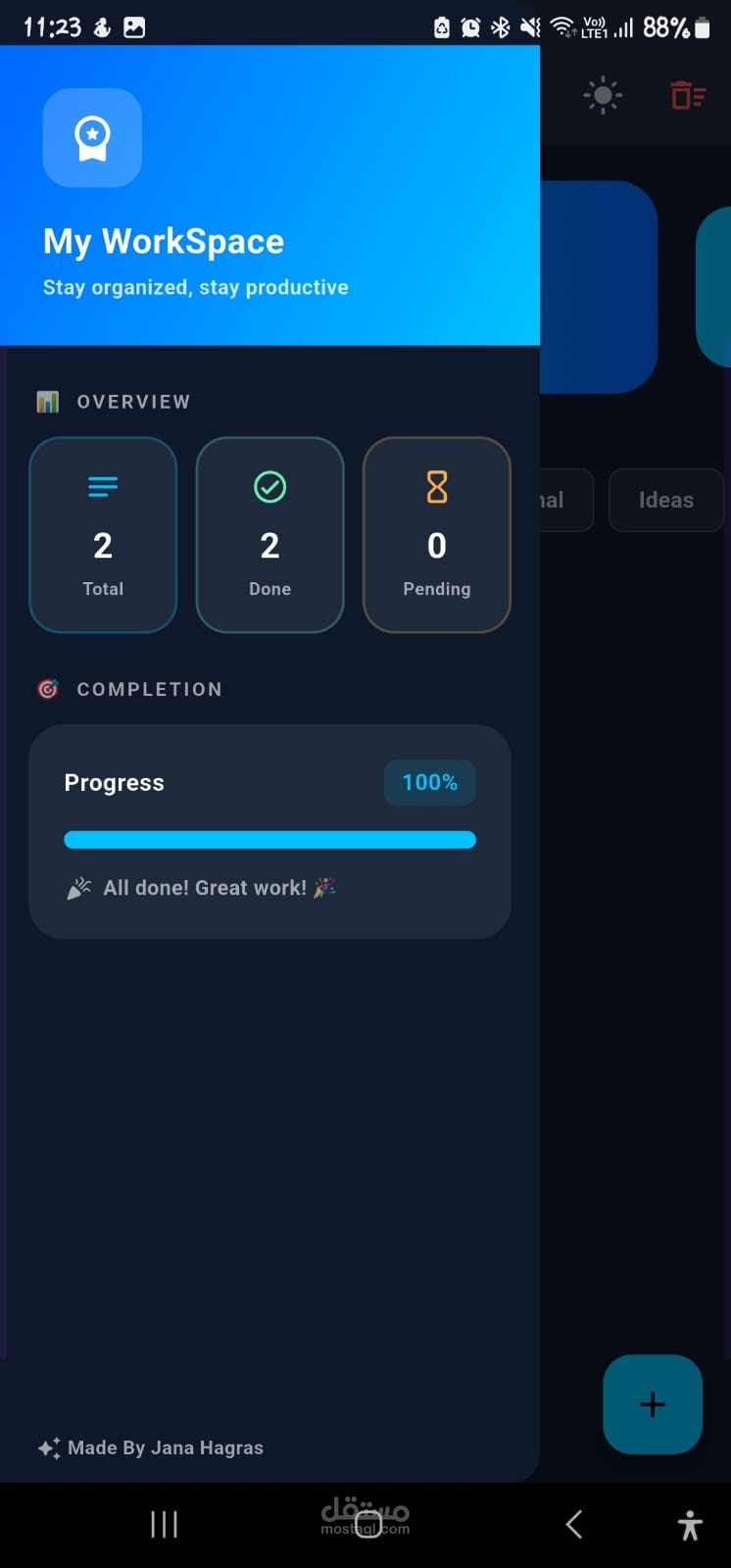 ✅ لوحة نظرة عامة بإجمالي المهام، المنجزة، والمعلقة