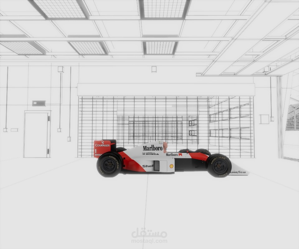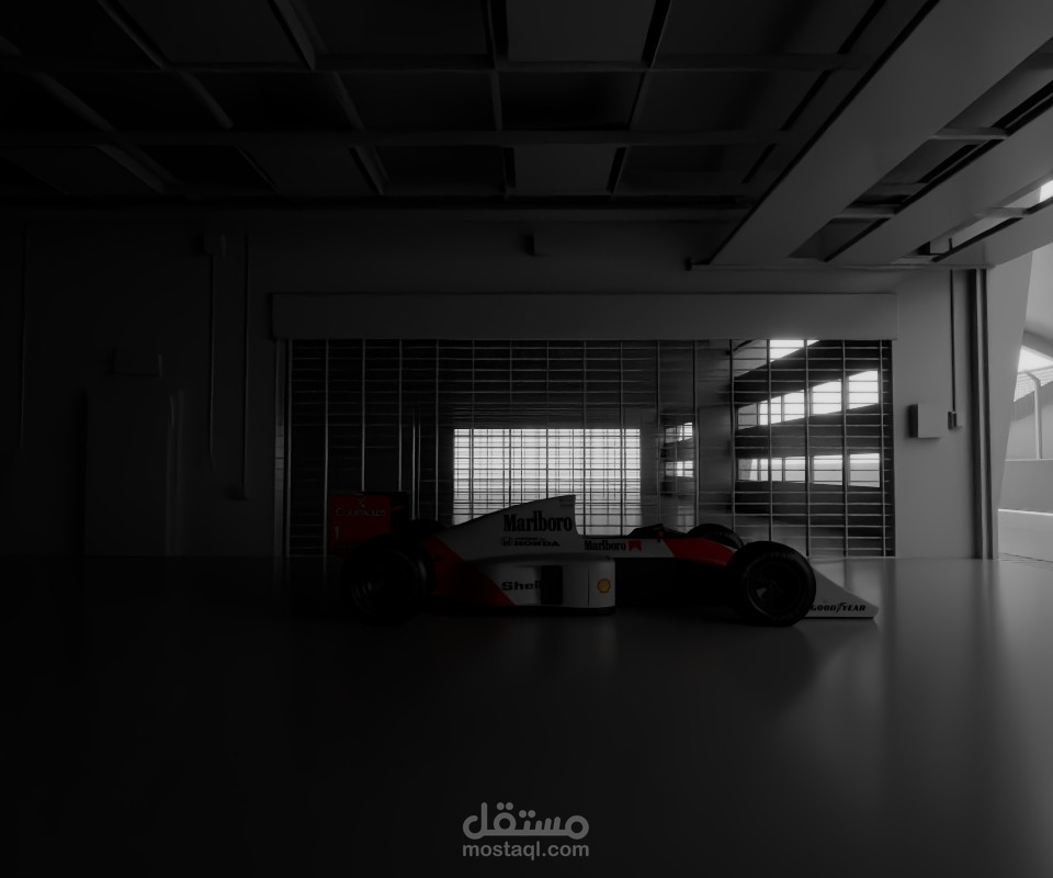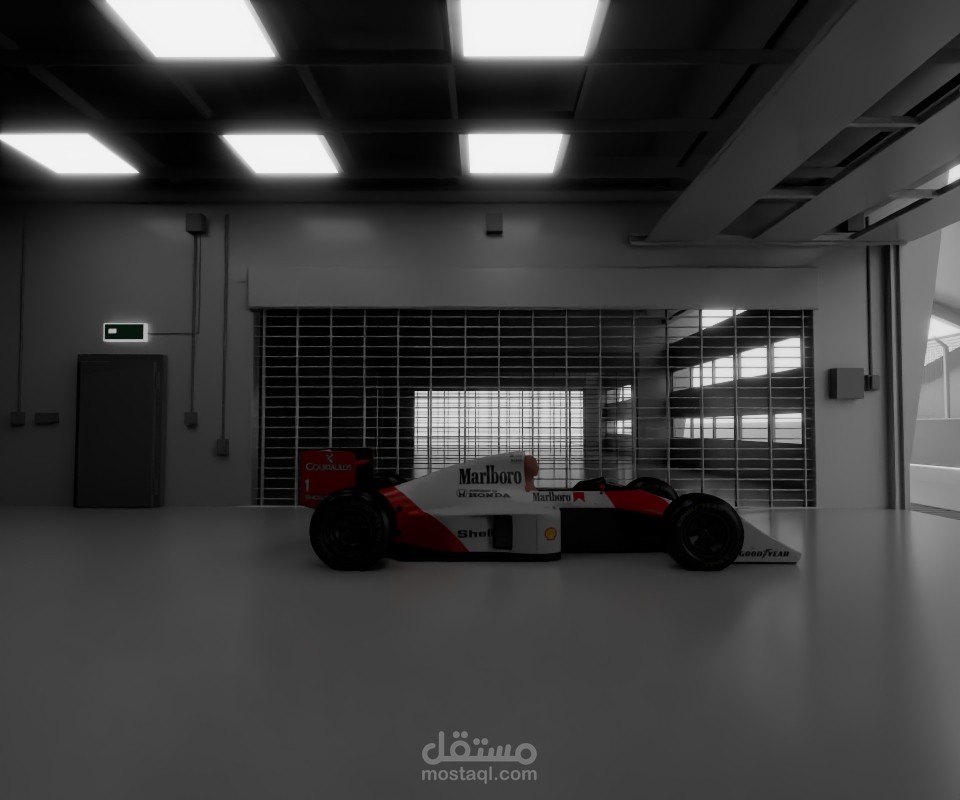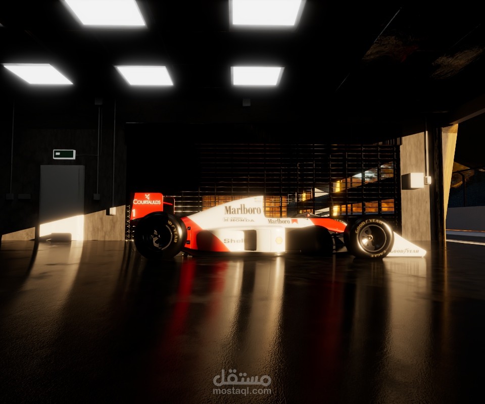 The scene focuses on realistic lighting, industrial materials, and subtle storytelling elements that reflect the intensity behind race-day moments.