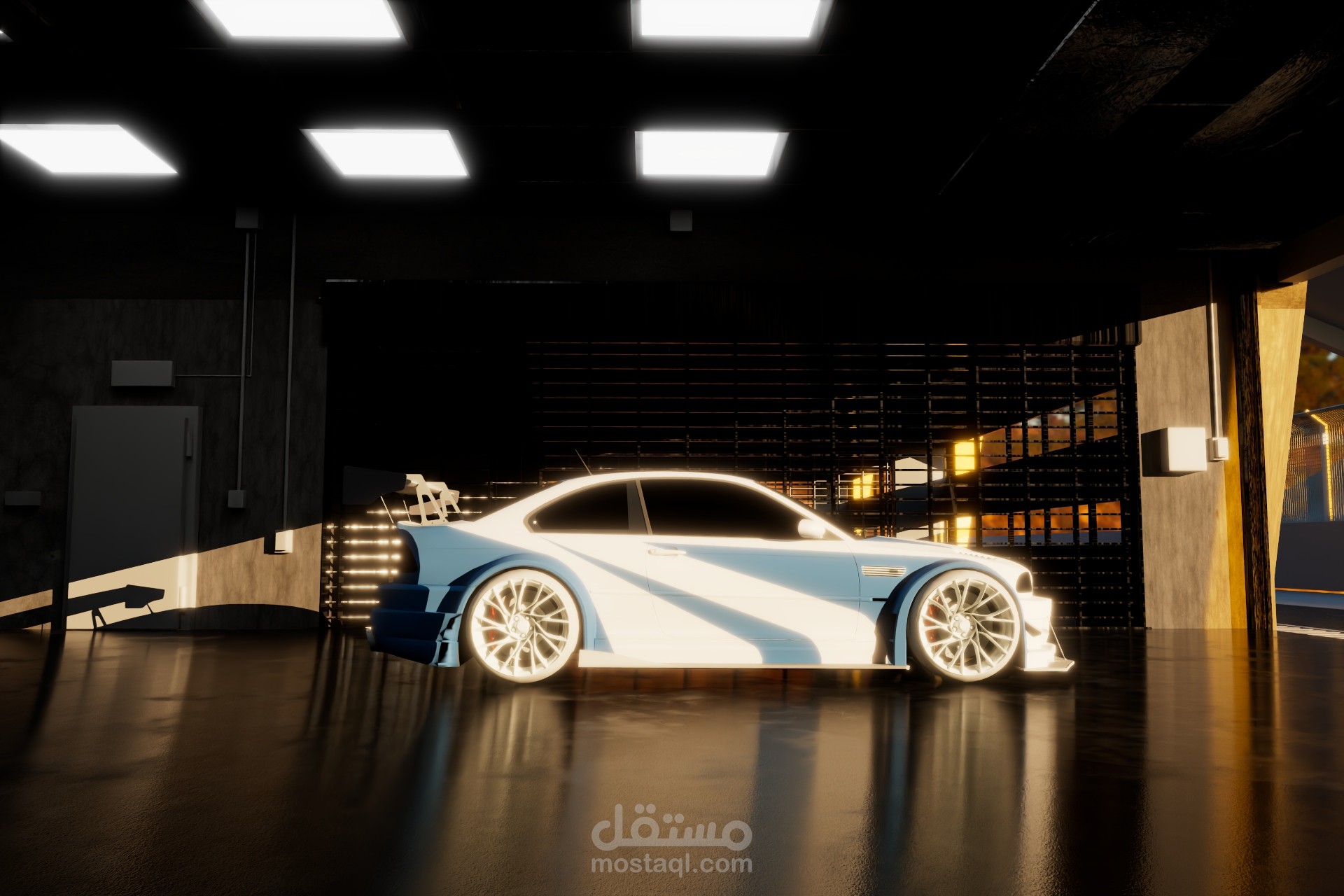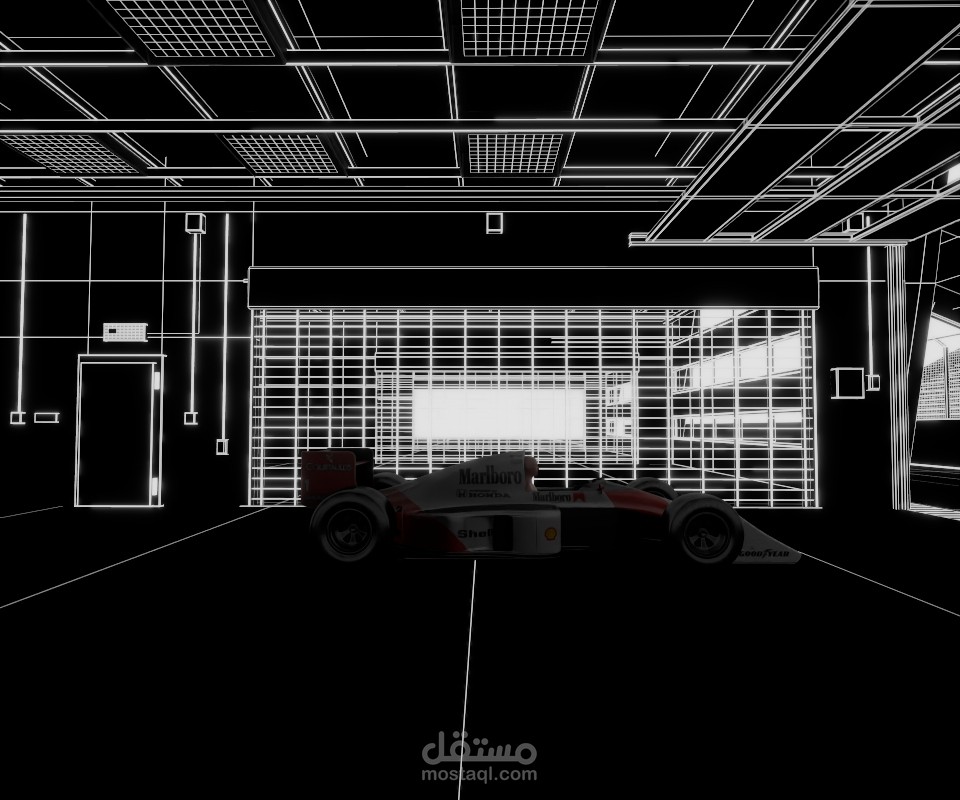 This 3D environment represents a high-performance racing garage designed to capture the raw atmosphere of motorsport preparation.