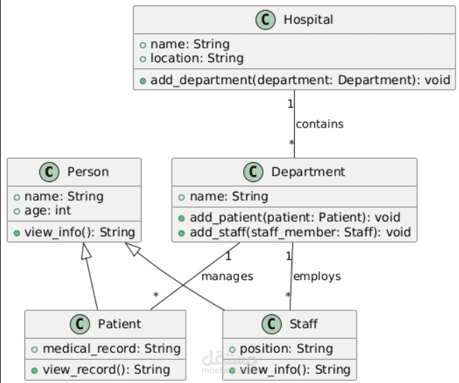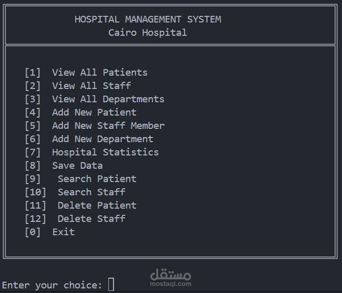 قمت بتطوير نظام إدارة مستشفى متكامل باستخدام لغة Python بالاعتماد على مبادئ البرمجة كائنية التوجه (OOP) لتنظيم العمليات الإدارية والطبية داخل المستشفى.