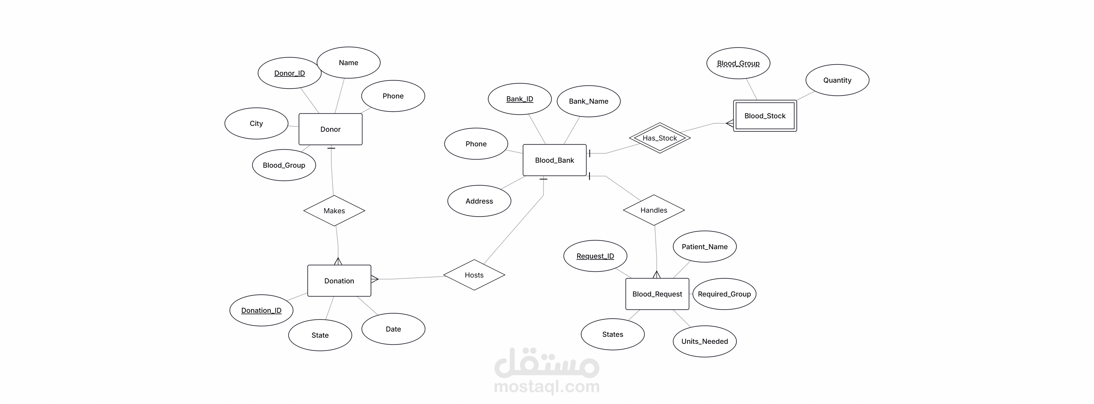 Entity Relationship Diagram (ERD): تم تحليل وتصميم الكيانات والعلاقات بينها بدقة (مثل العلاقة بين المتبرع، بنك الدم، والمريض).