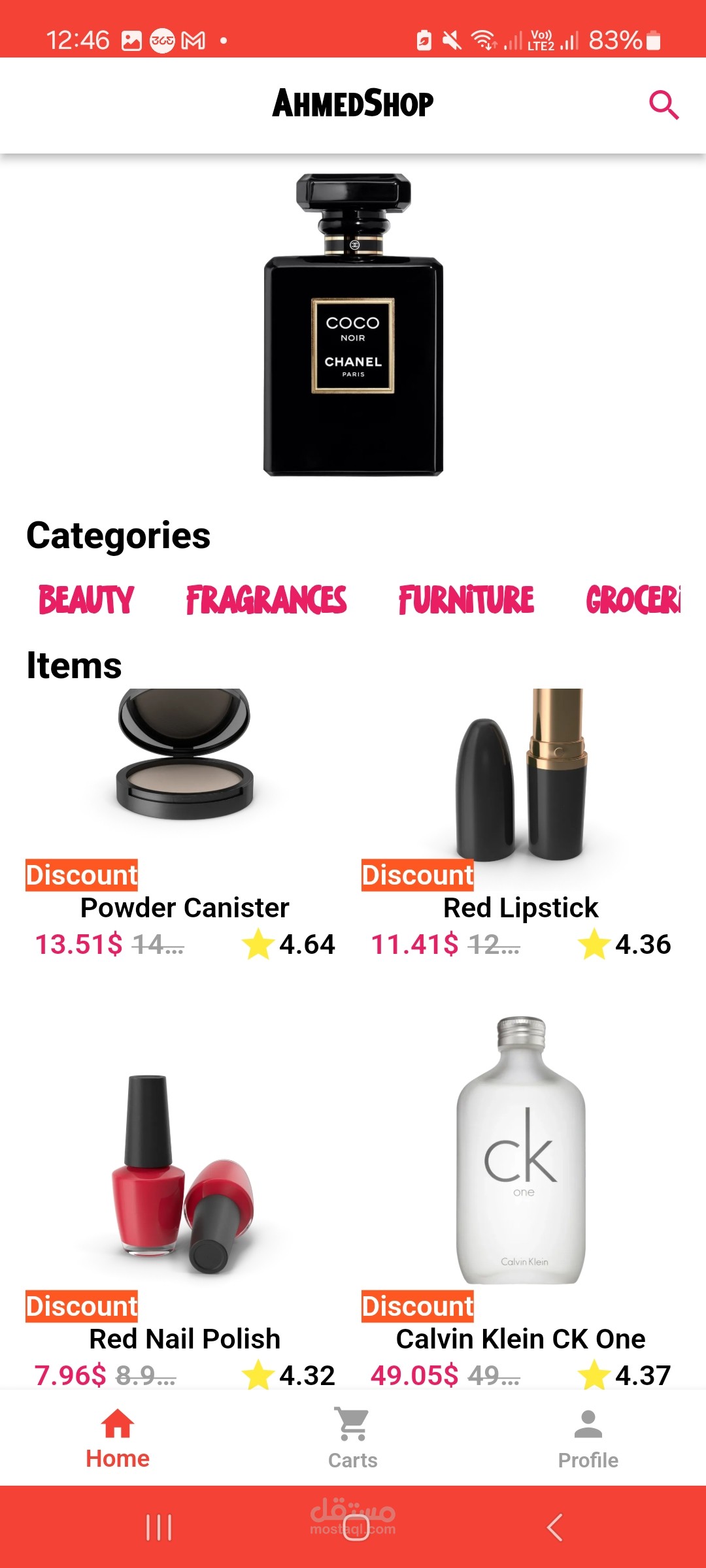 تطبيق متجر إلكتروني لعرض المنتجات وإدارتها باستخدام Dummy API لمحاكاة البيانات الحقيقية، بهدف تطبيق مفاهيم ربط الـ APIs وبناء تطبيق تجارة إلكترونية متكامل.