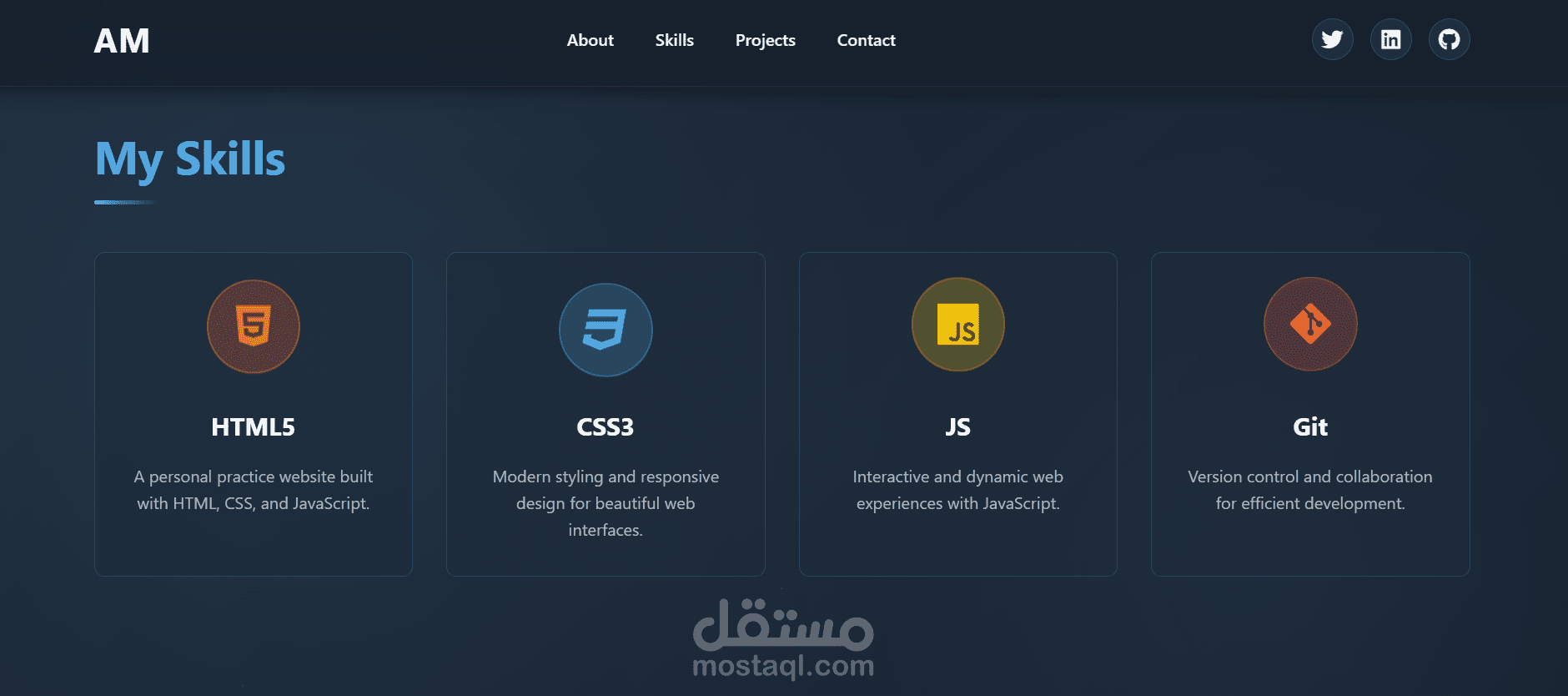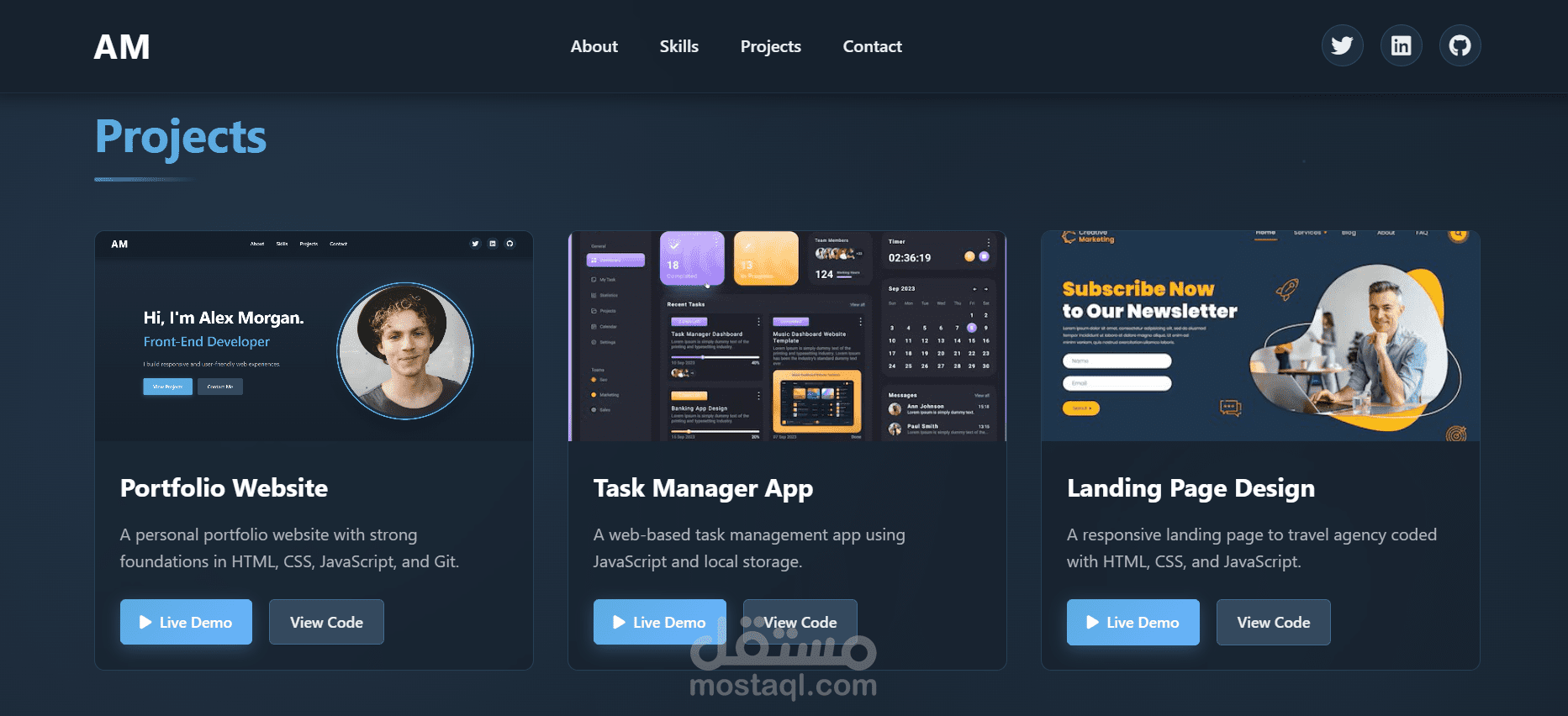 تصميم وتطوير موقع شخصي (Portfolio) لمطور Front-End مكوّن من صفحة واحدة (One Page Website) بأسلوب عصري ومتجاوب مع جميع الأجهزة.