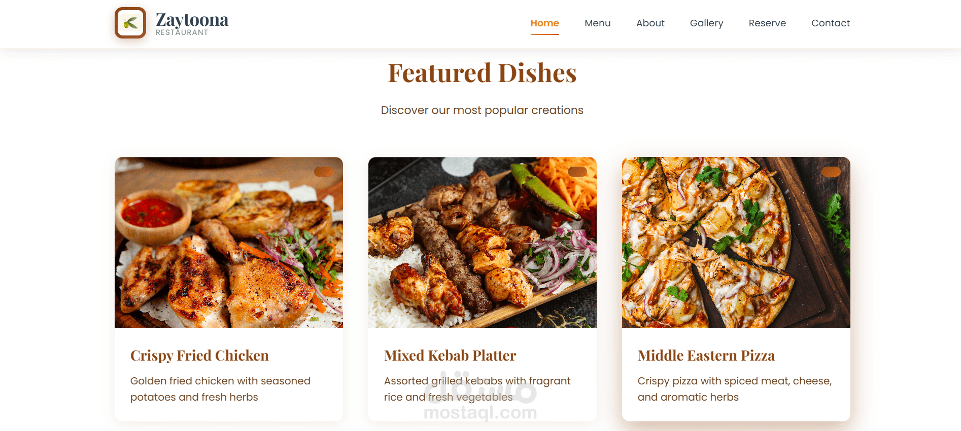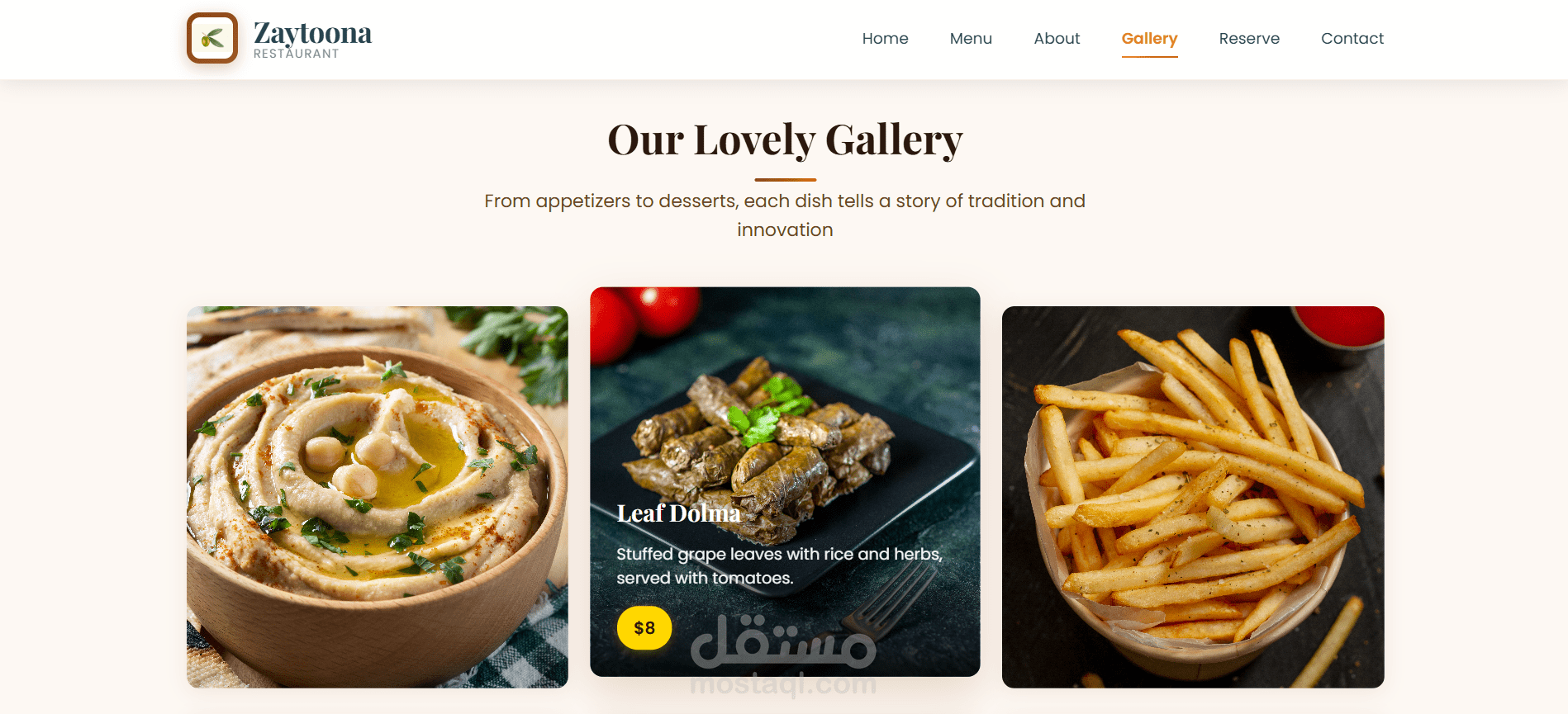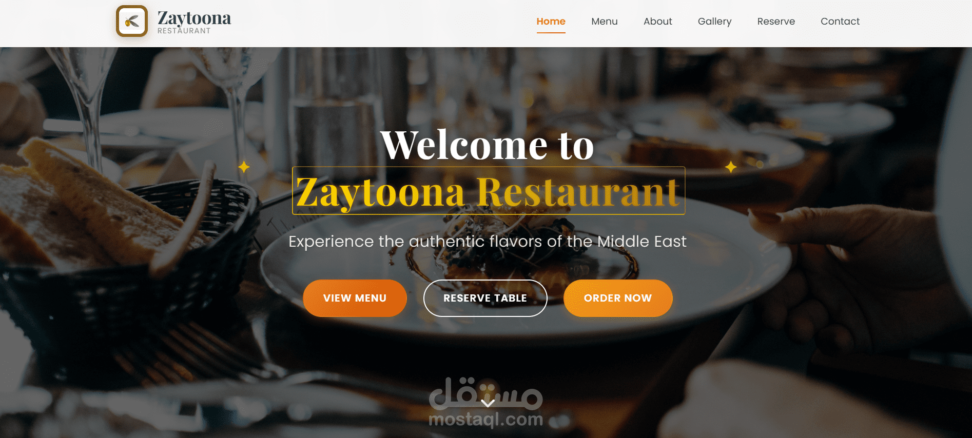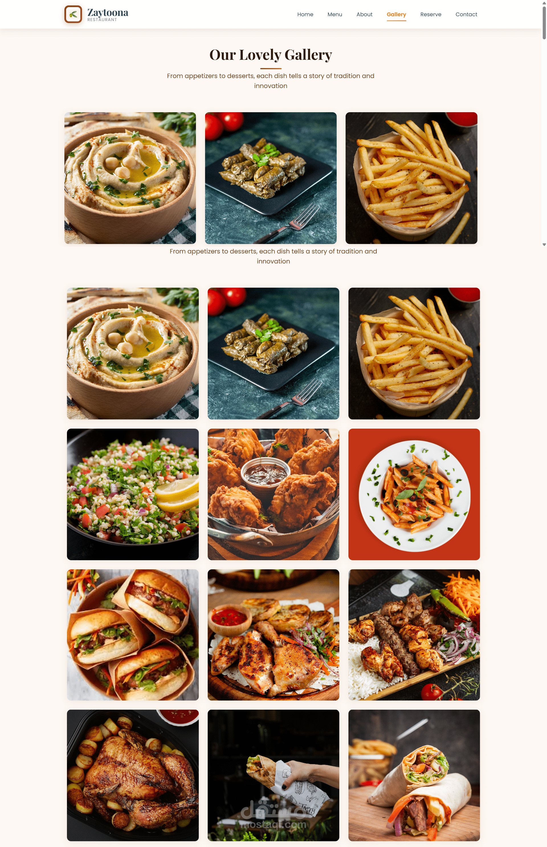Zaytouna Restaurant Website هو مشروع Front-End متكامل لموقع مطعم مكوّن من 6 صفحات (Home, Menu, About Us, Reservation, Contact , Gallery).