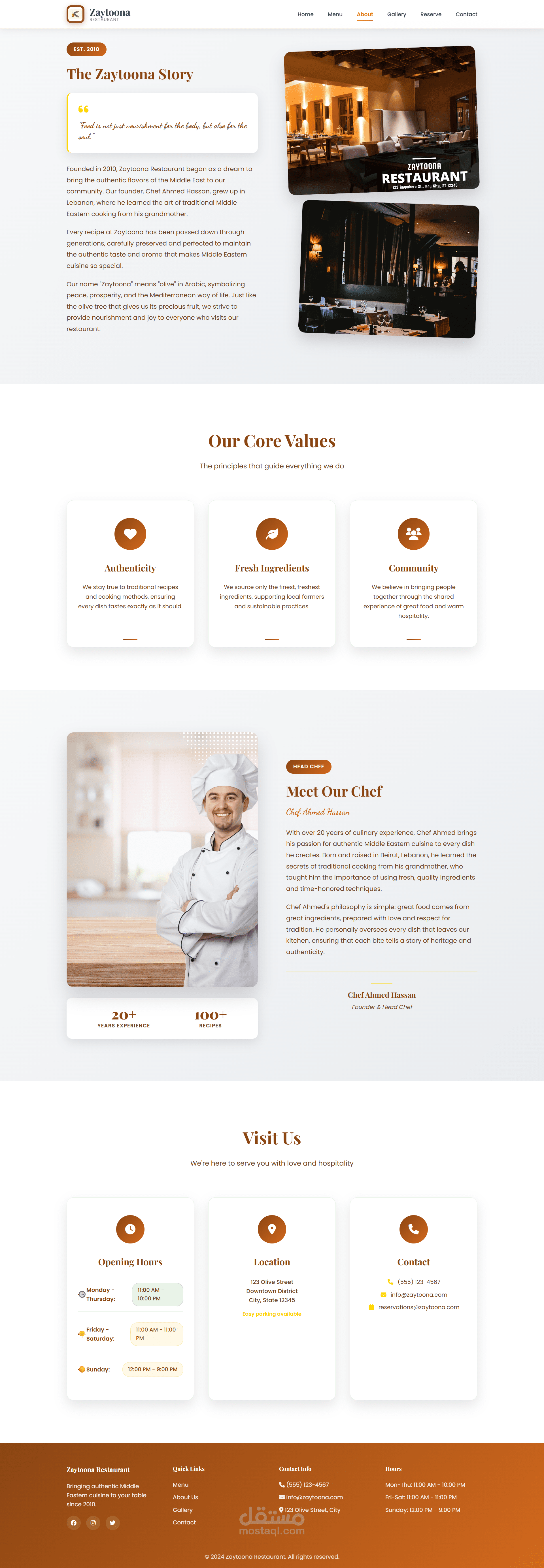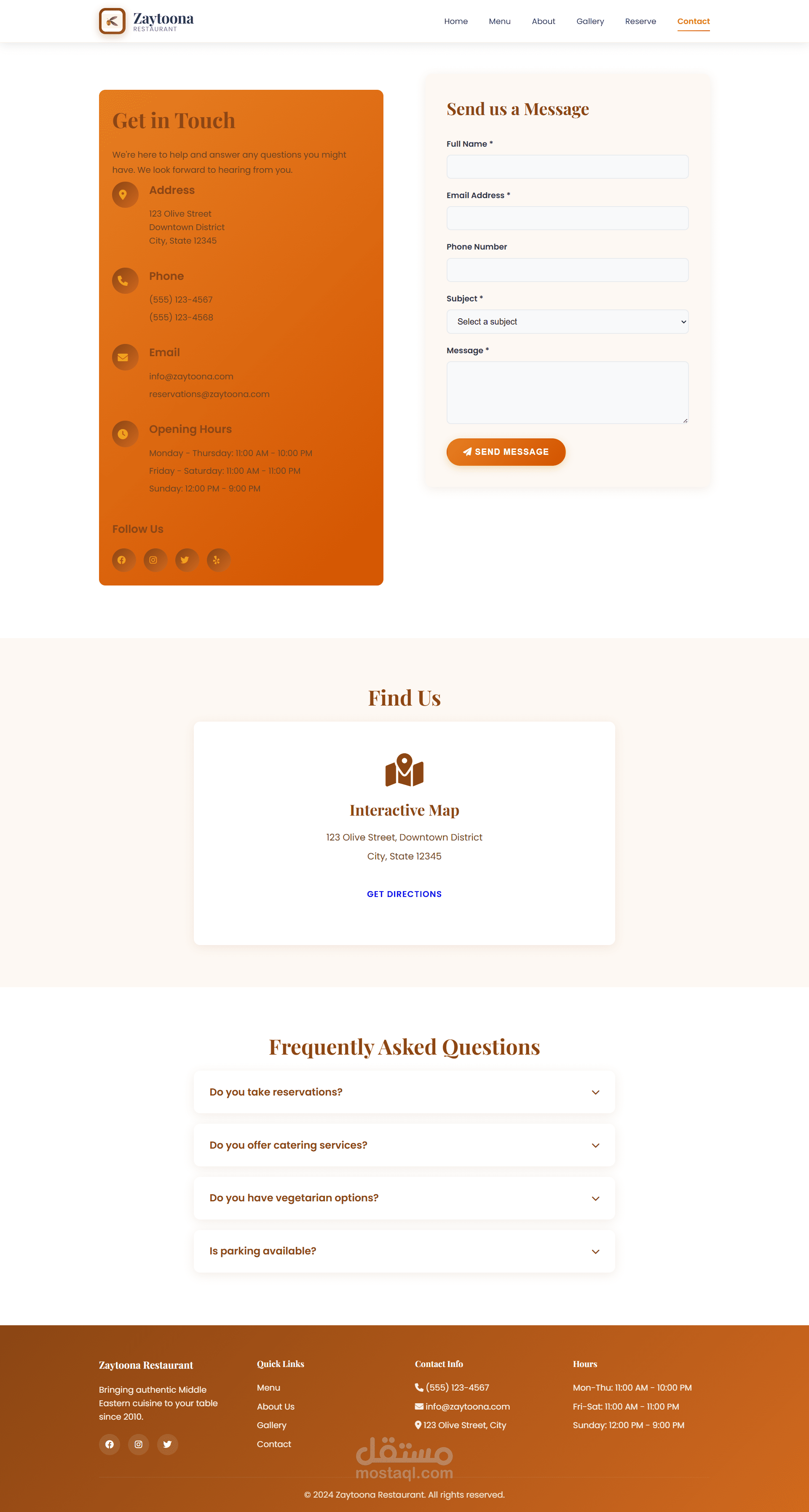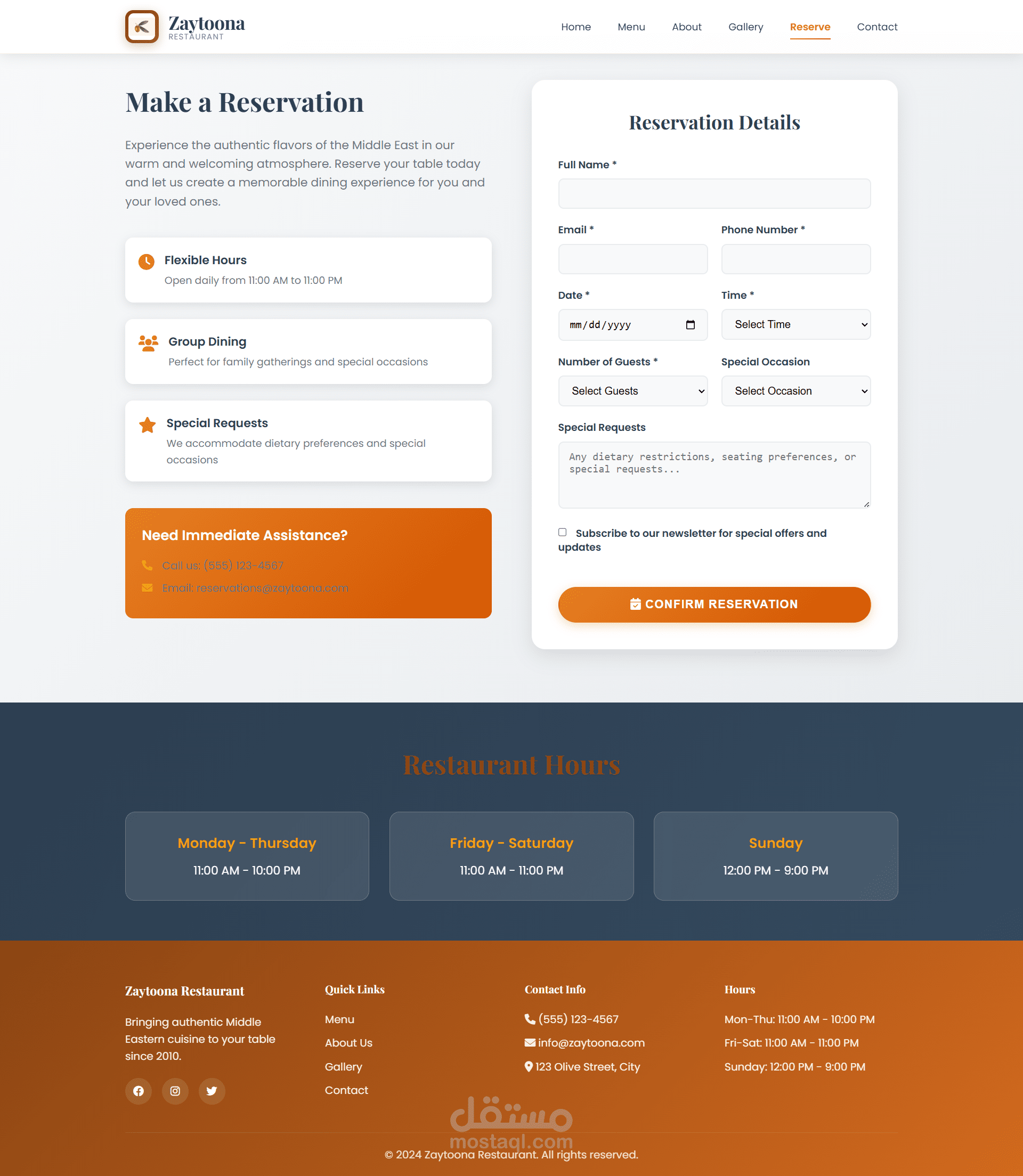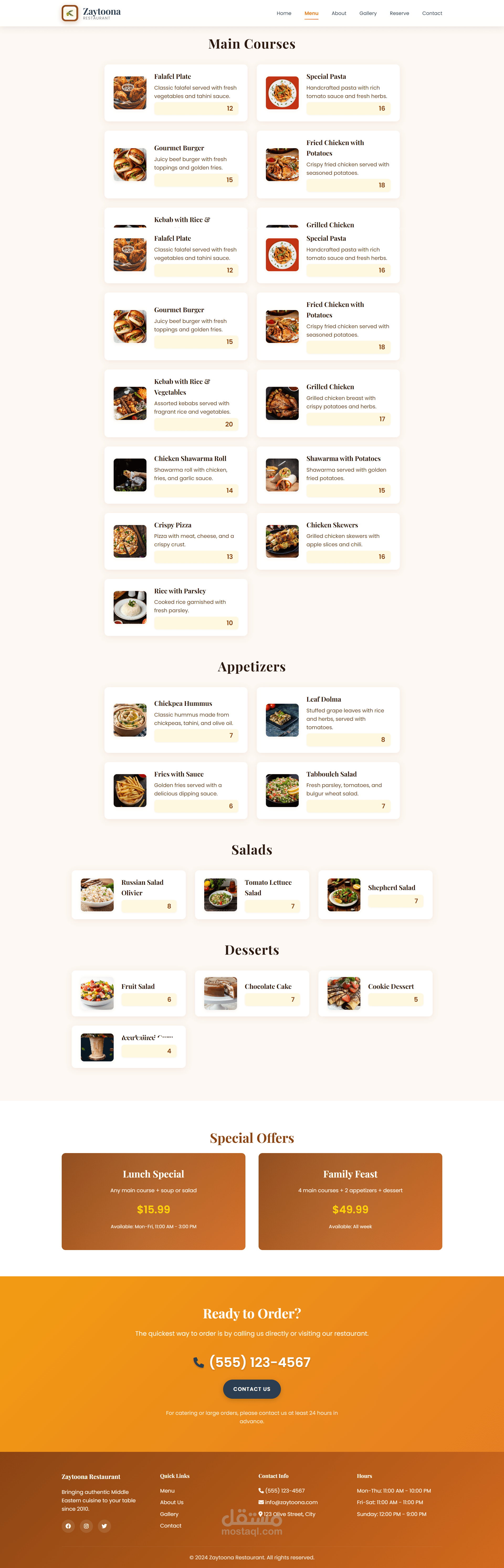 Zaytouna Restaurant Website هو مشروع Front-End متكامل لموقع مطعم مكوّن من 6 صفحات (Home, Menu, About Us, Reservation, Contact , Gallery).