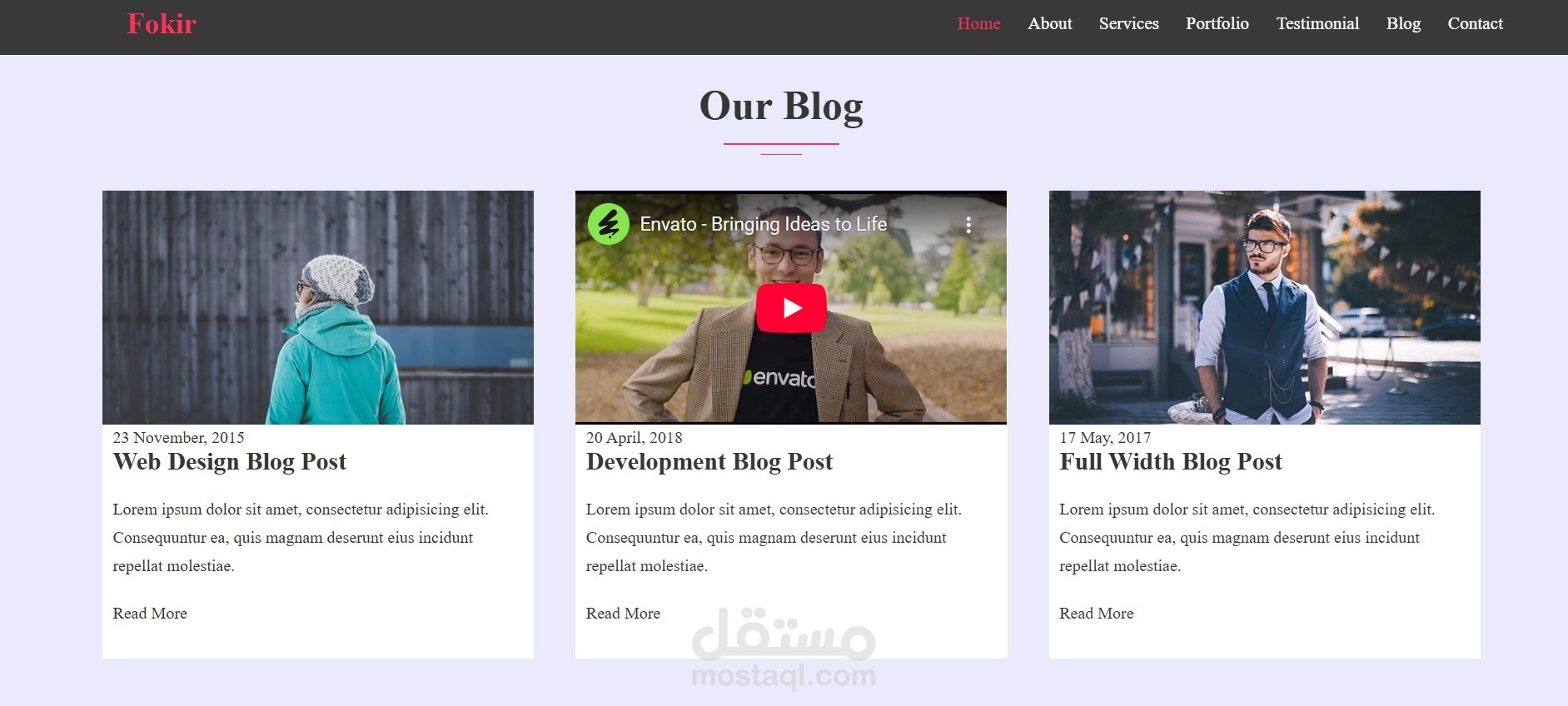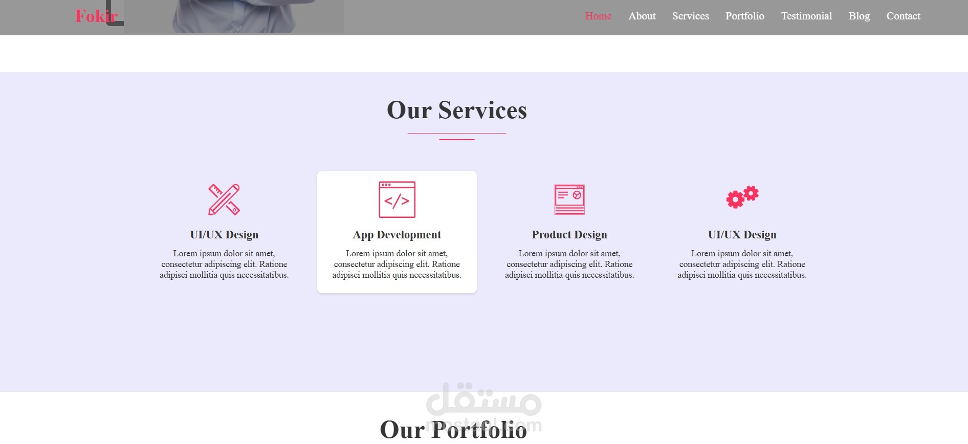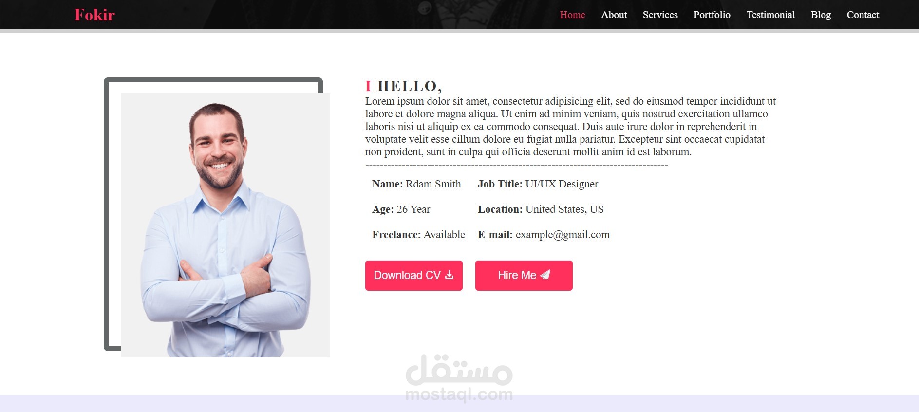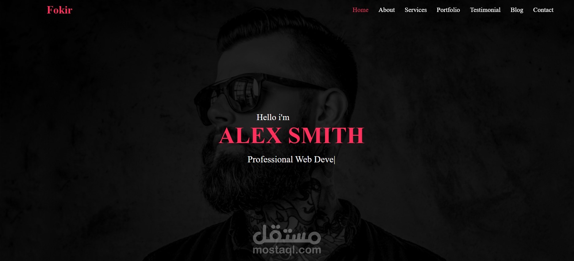 الصفحة الرئيسية تعرض اسم صاحب الموقع ومهنته بشكل بصري واضح، مع قائمة تنقل (Navigation) تصل إلى الأقسام المختلفة مثل Services، Portfolio، Testimonial، Blog، وContact. تم التركيز على تصميم نظيف ومنظم مع استخدام ألوان متناسقة وتنسيق خطوط احترافي، مما يعكس جودة عالية في عرض المحتوى وتجربة المستخدم.