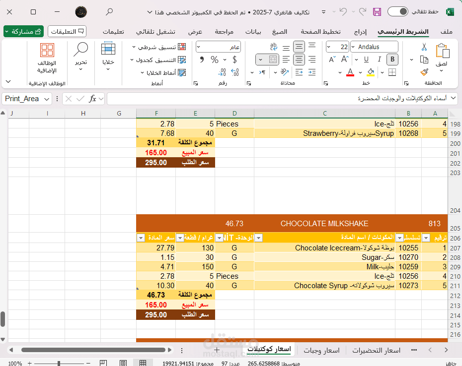 جدول تسعير وإدارة منتجات غذائية منظم بشكل احترافي في ملف إكسل. يوضح تفاصيل الوجبات والسندويشات المختلفة مع بيانات دقيقة عن: