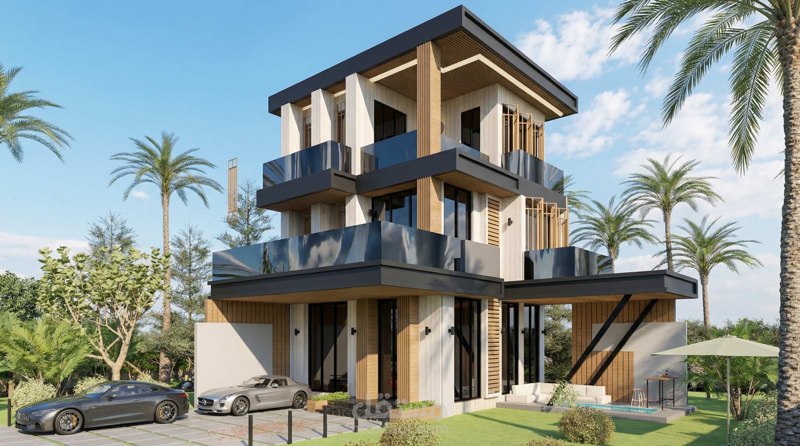 Standing as a bold statement of modern residential architecture, this three-story villa relies on a dynamic composition of deep overhangs and cantilevered slabs. This geometric purity creates a striking "floating" effect, giving the structure a lightweight yet commanding presence within its landscape.