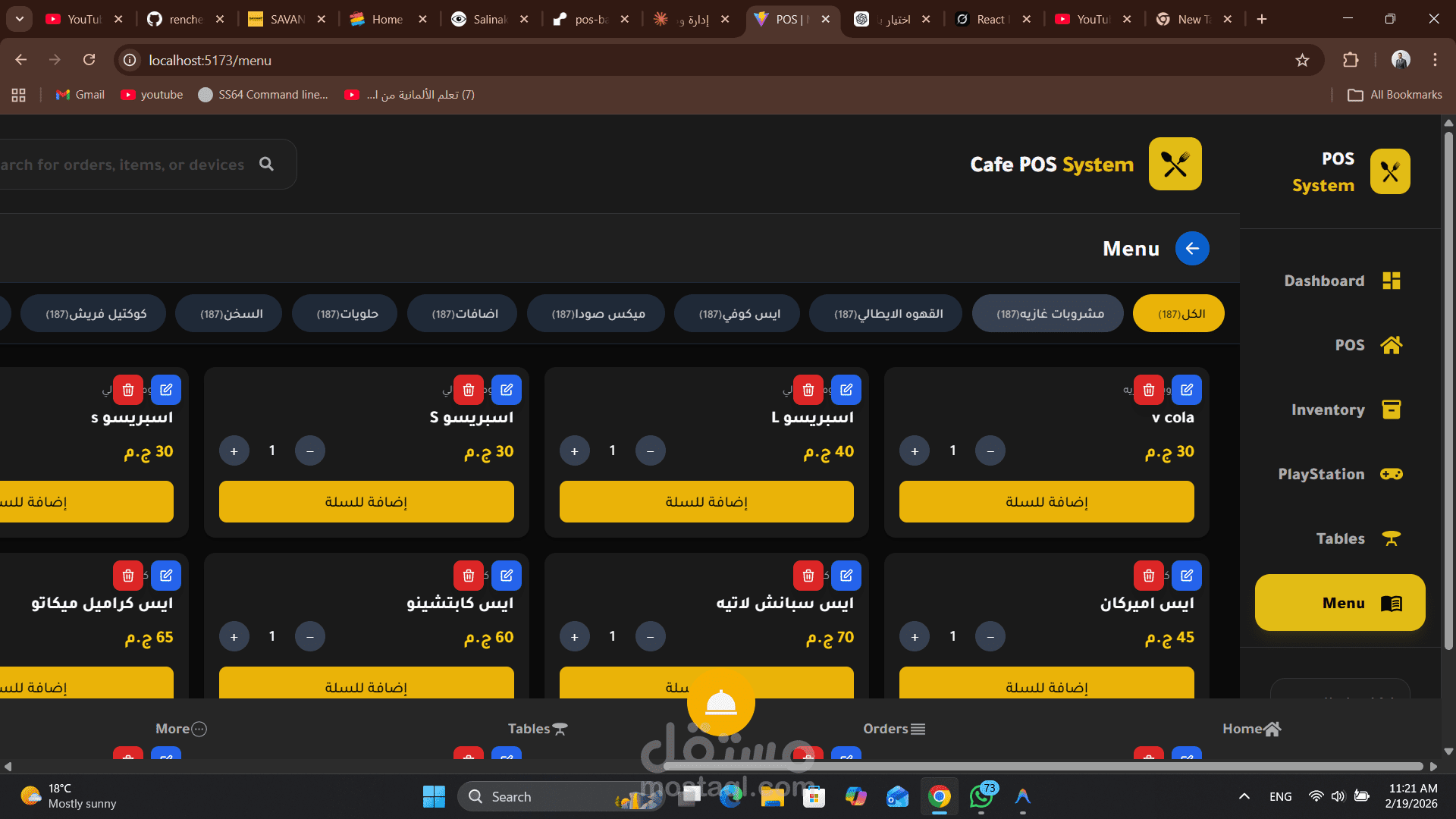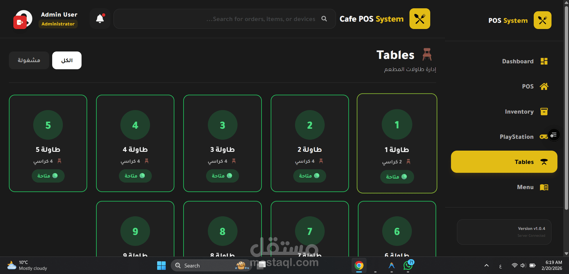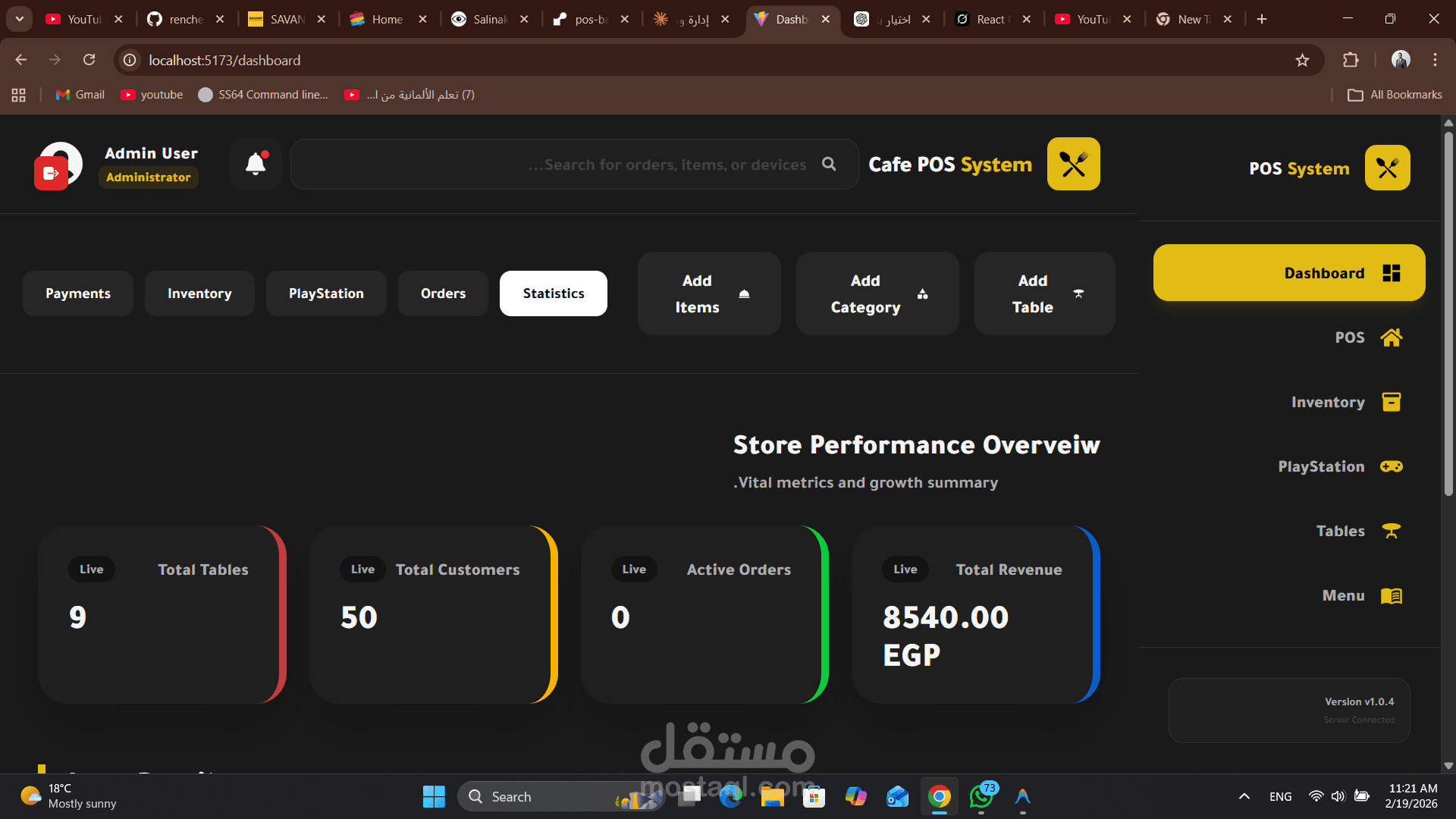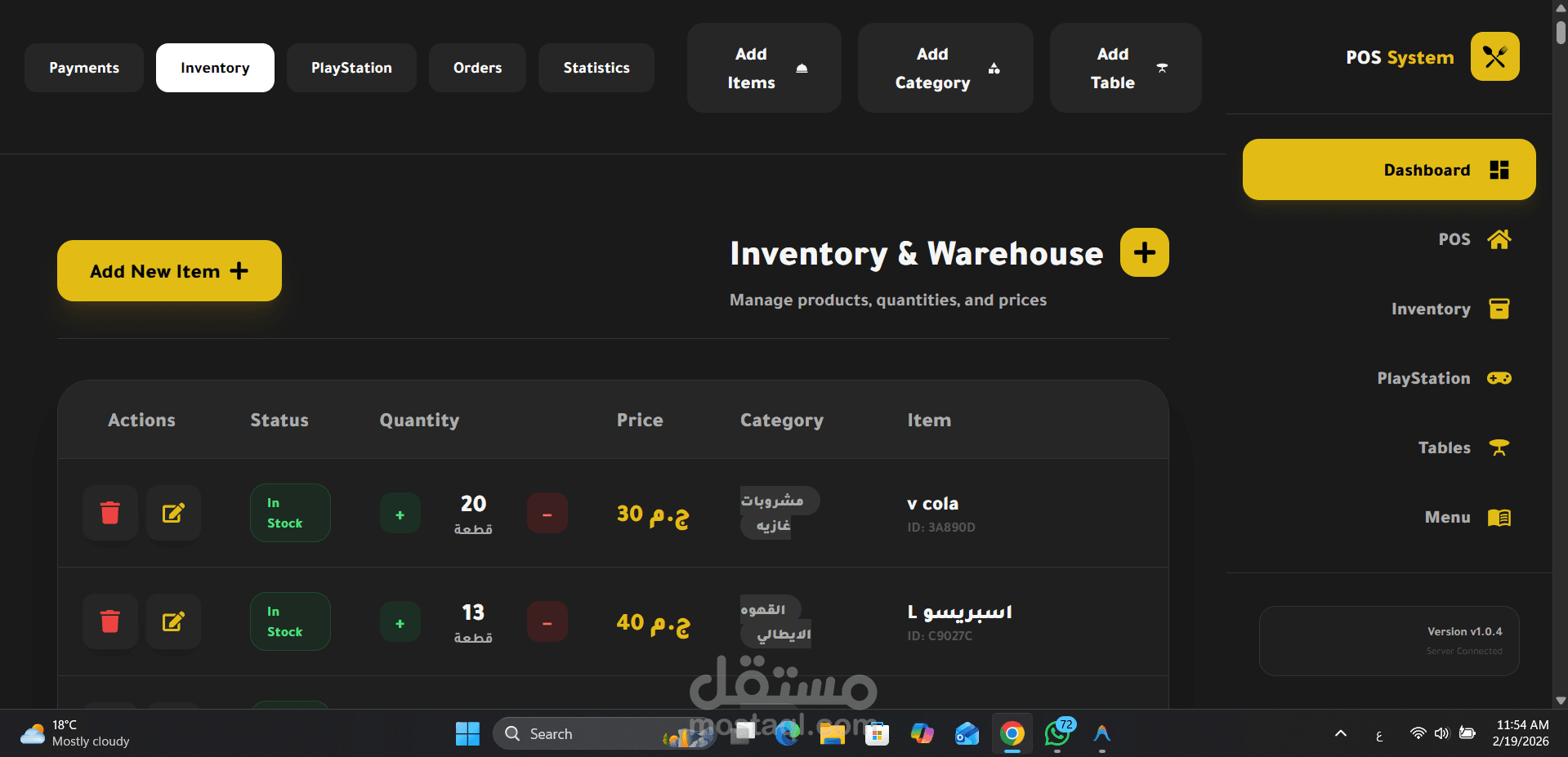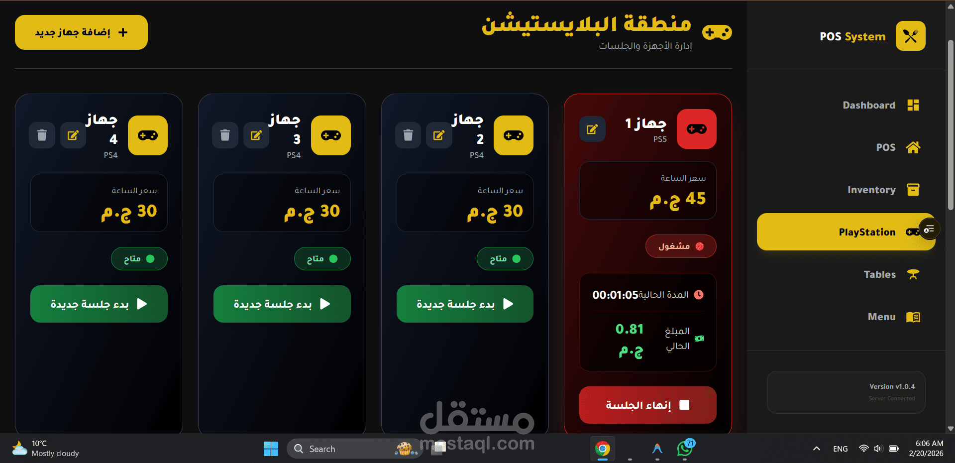 نظام نقاط بيع شامل لإدارة المطاعم ومقاهي ألعاب بلاي ستيشن. مبني باستخدام حزمة MERN (MongoDB، Express.js، React، Node.js) مع دعم لإدارة الطاولات، وتتبع المخزون، ومعالجة الطلبات، وإدارة جلسات بلاي ستيشن، وطباعة الإيصالات الحرارية.