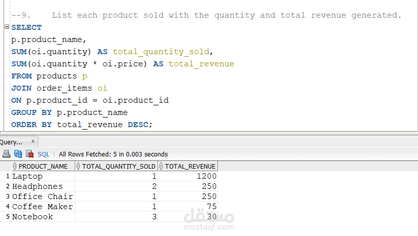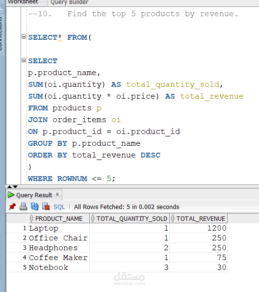 Insight Generation: Successfully extracted high-value reports, including Top 5 products by revenue and recent order trends, to support data-driven decision-making.